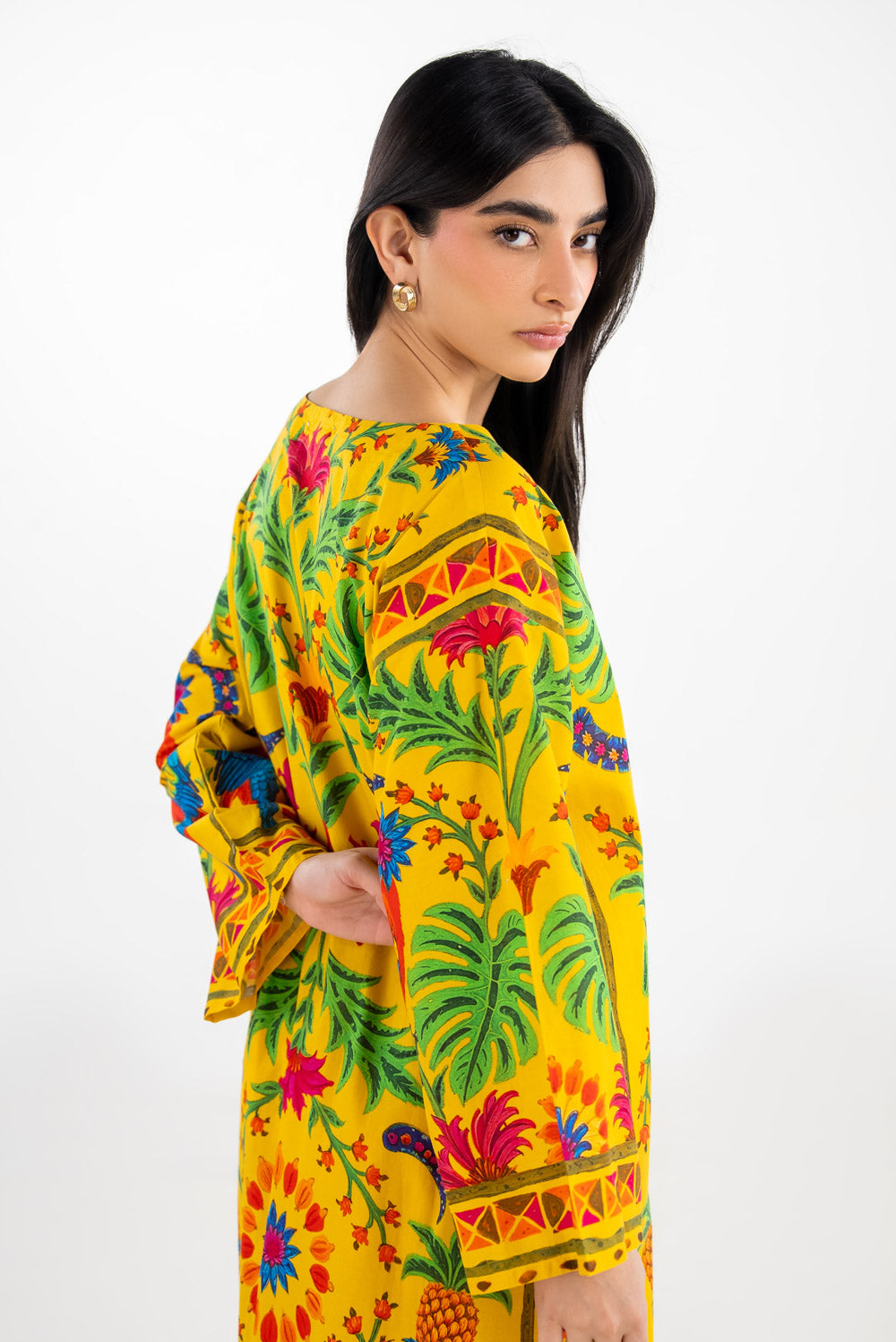 Bursting with a vibrant yellow hue, this printed cambric co-ord set captures the joyful spirit of summer days. The loose fit drapes effortlessly, offering breathable comfort and freedom of movement throughout the day. Perfect for bright daytime outings or casual gatherings where color takes the spotlight.