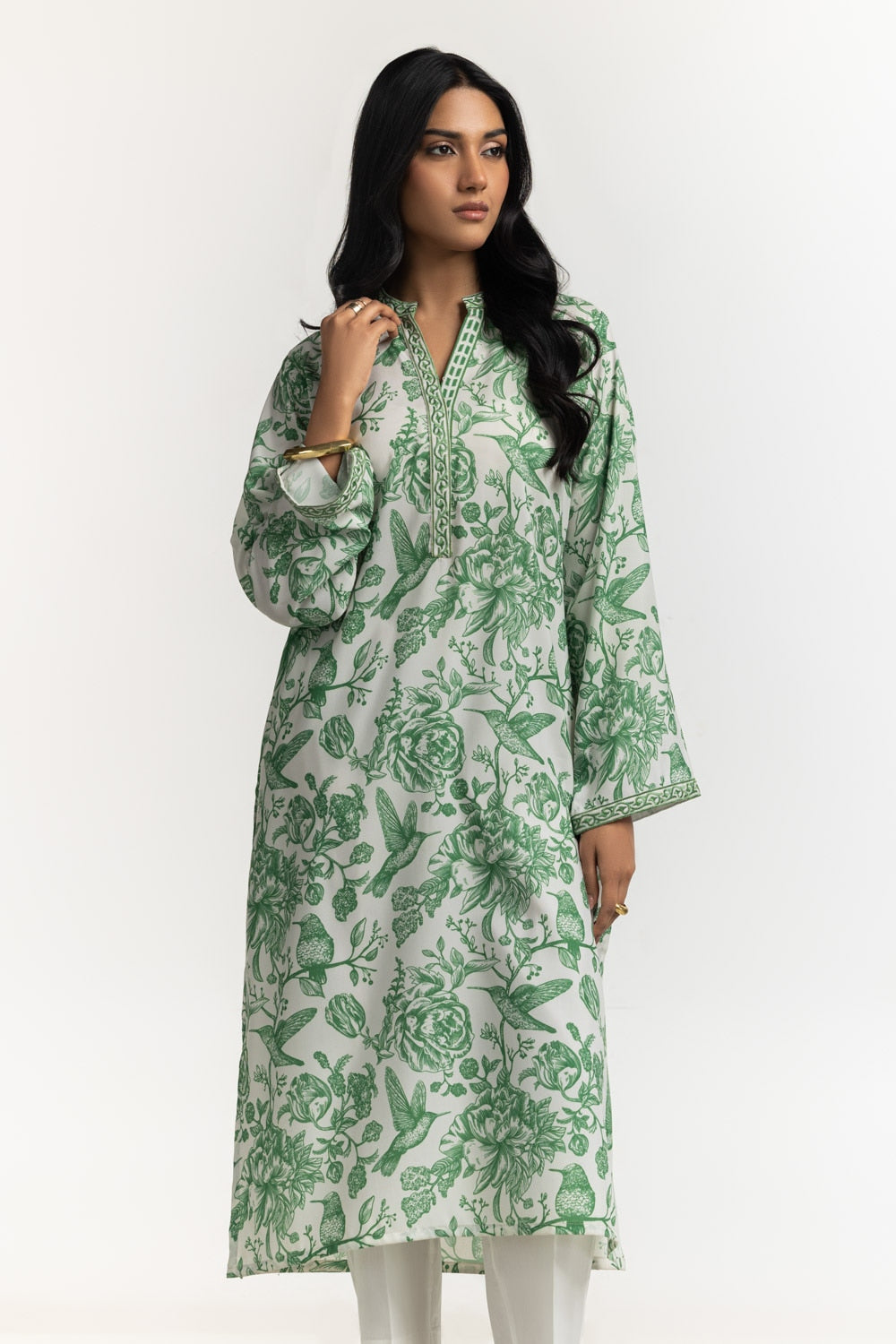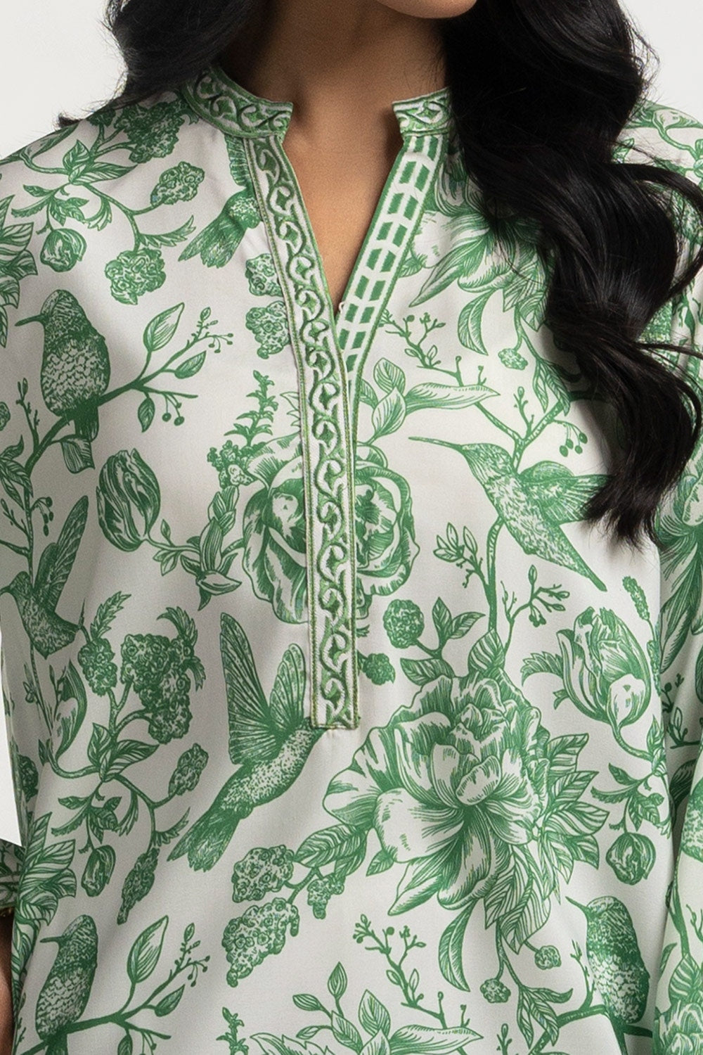 This breezy shirt is effortlessly chic with the charming green toile print and delicate embroidery. It's light weight fabric and relaxed fit makes it a perfect pick for casual outings or sunny afternoons throughout the summer season.