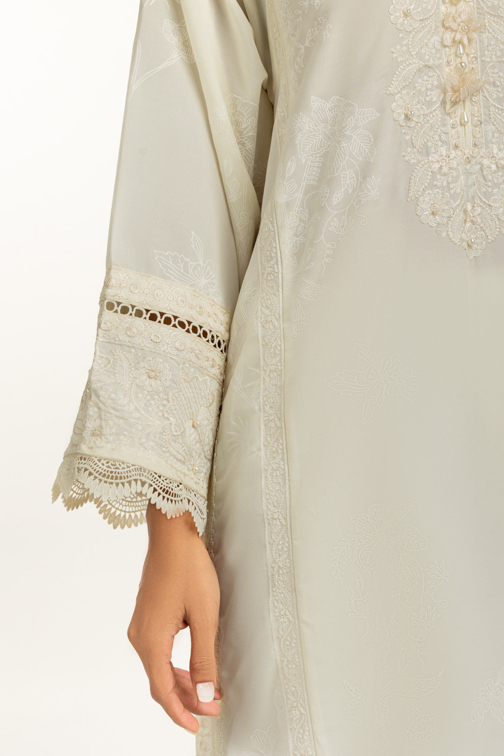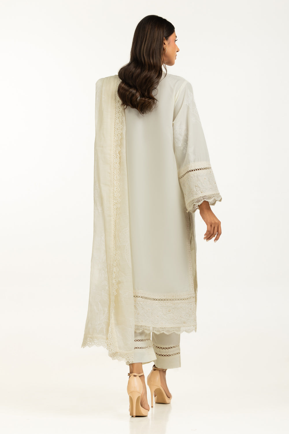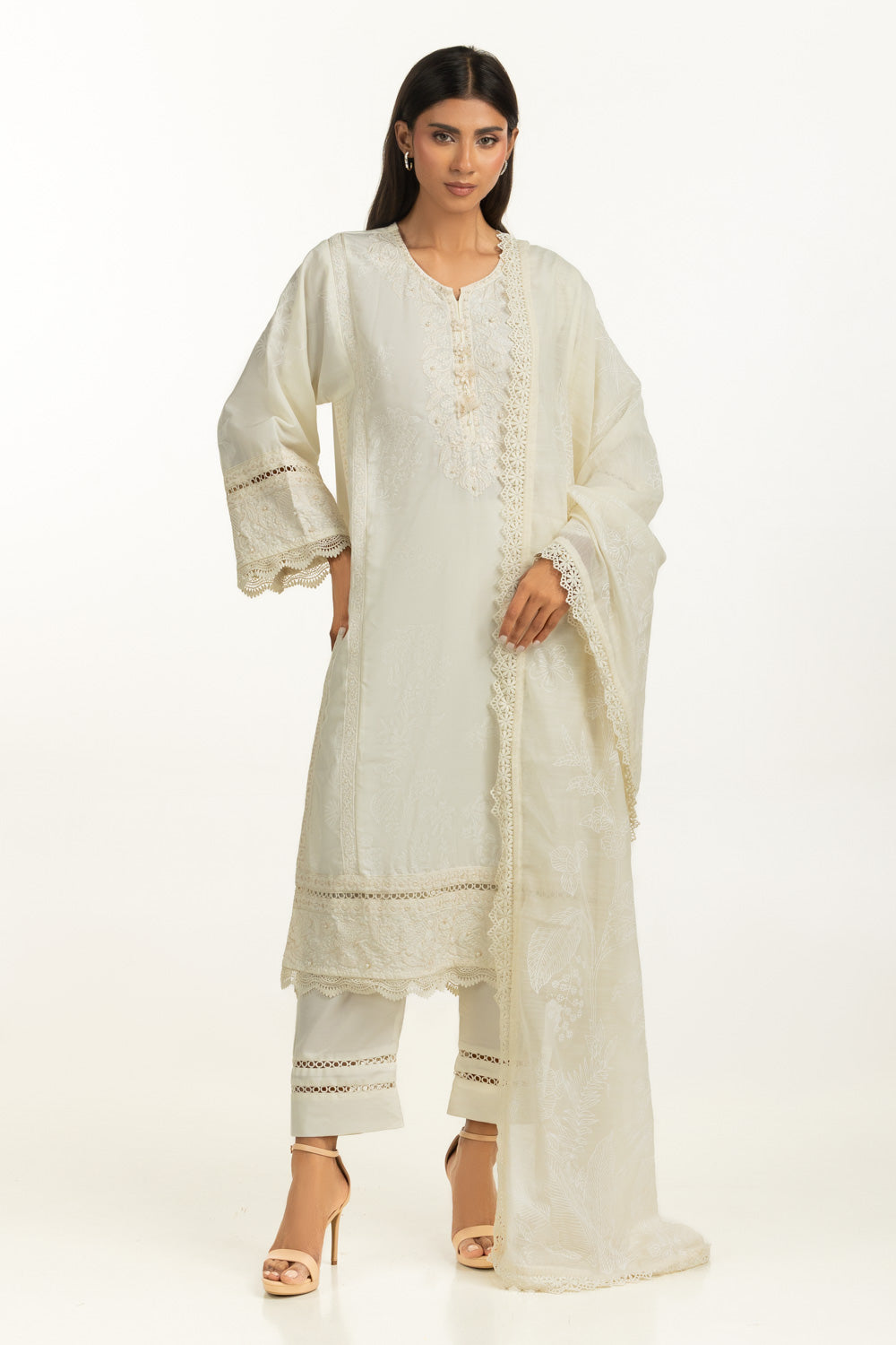 This suit focuses on comfort with its lightweight cambric base. Featuring a beautiful floral embroidery with 3D flowers enhance the overall look and feel of the outfit. While the soft off-white hue, makes it a perfect pick for long summer wear.