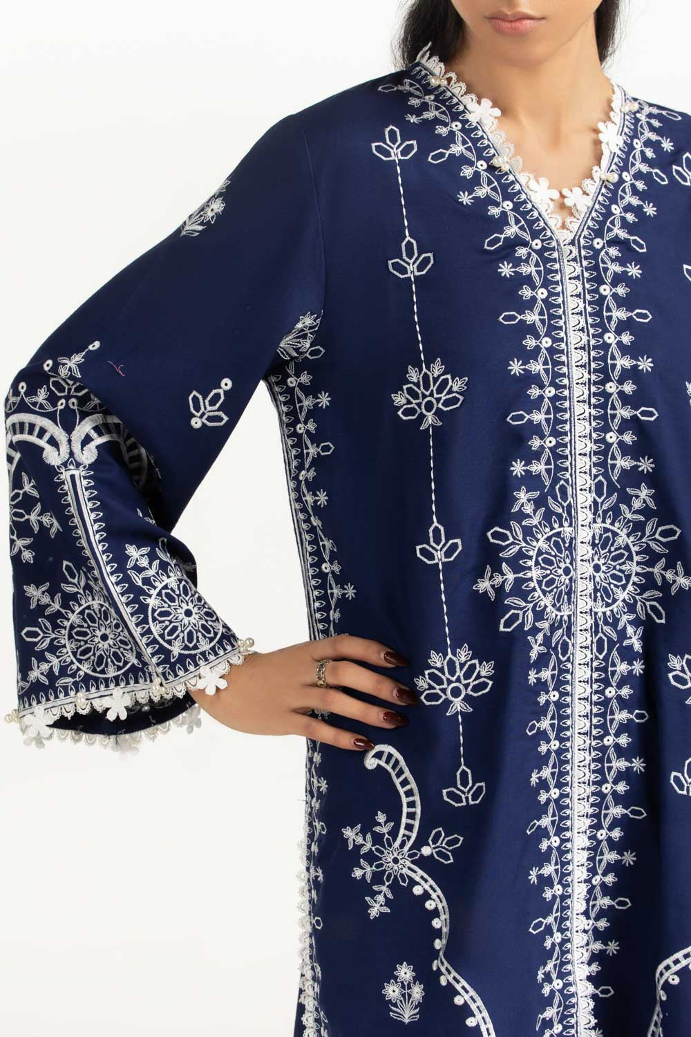 Details: Embroidered suit featuring v-neckline and delicate lacework.