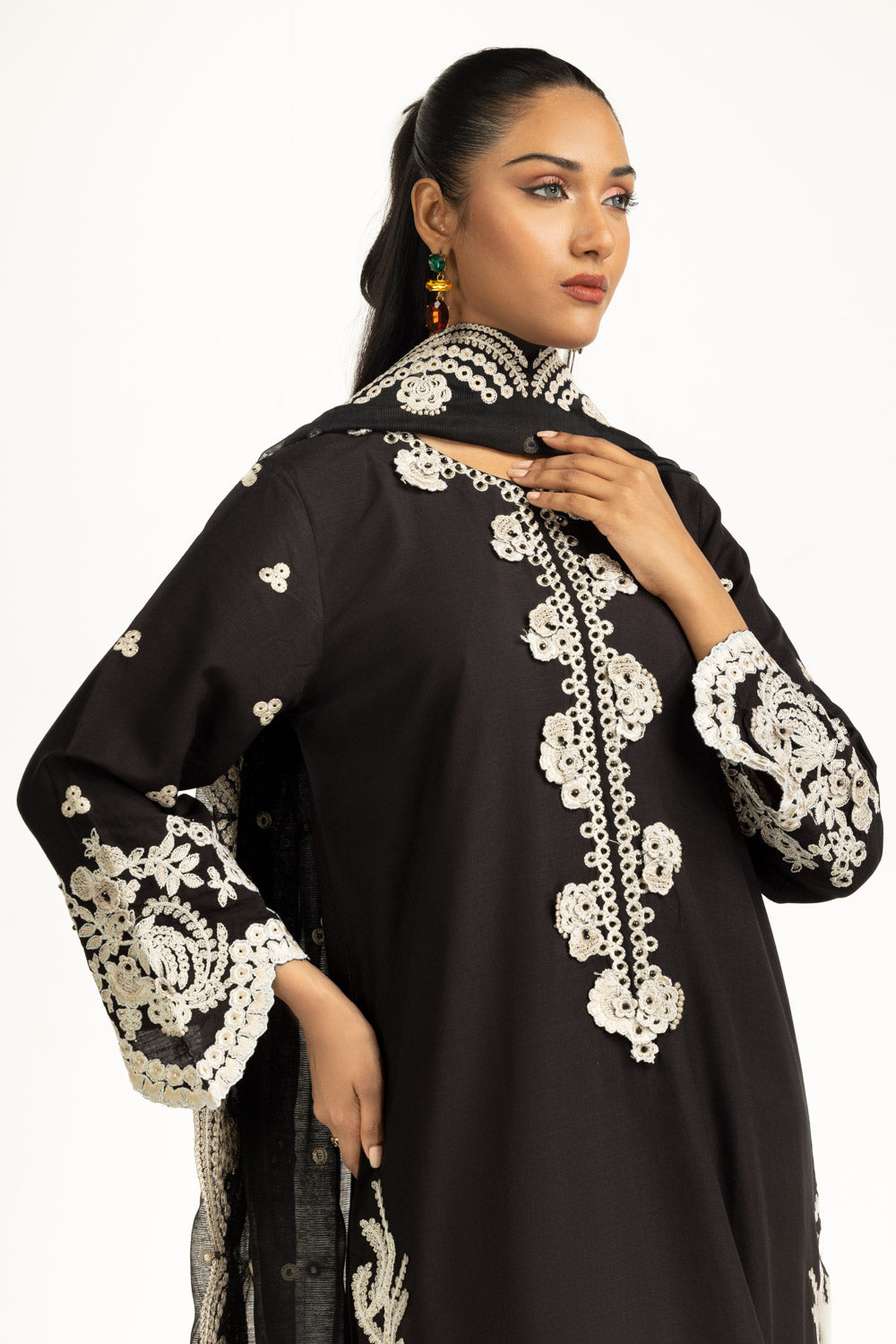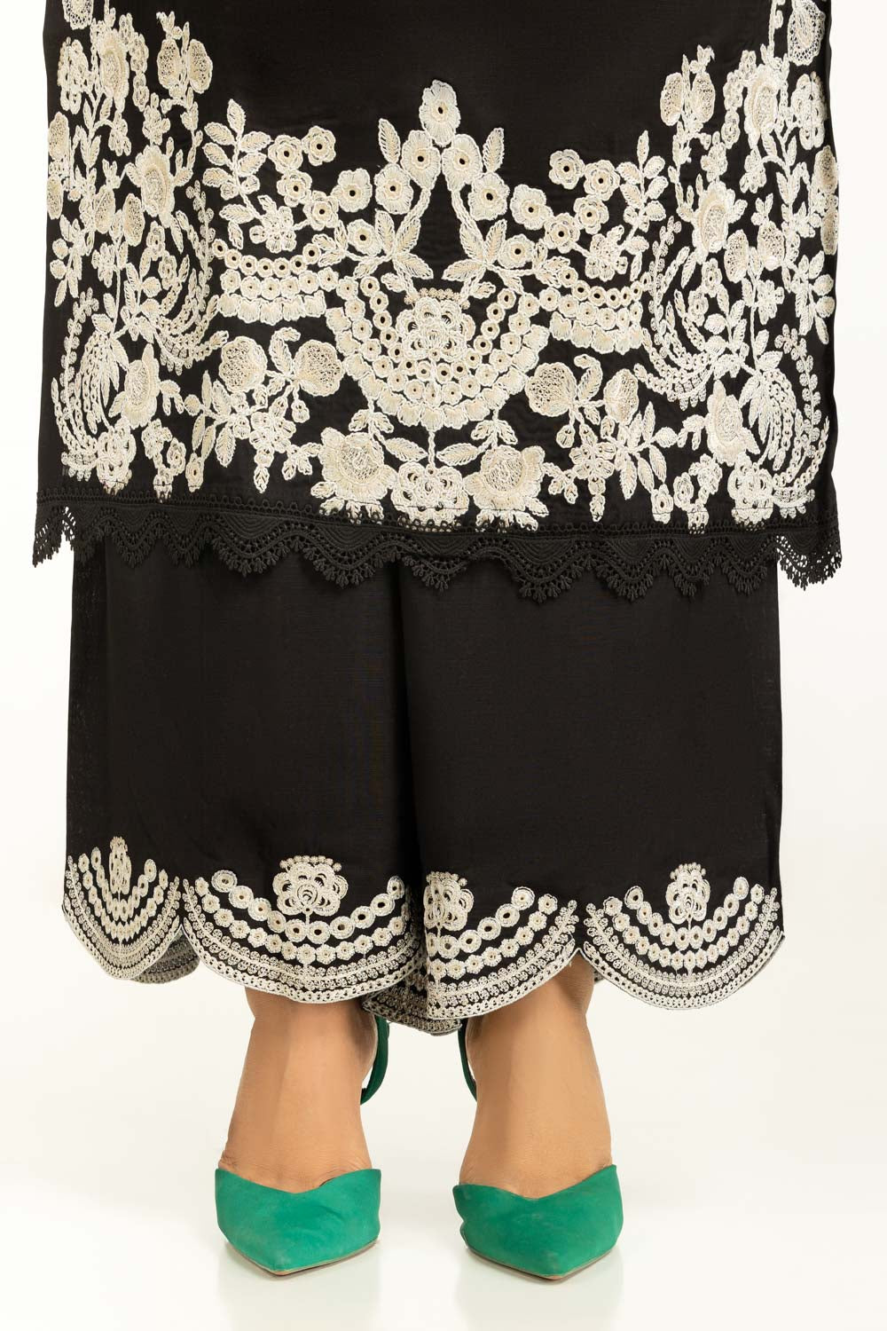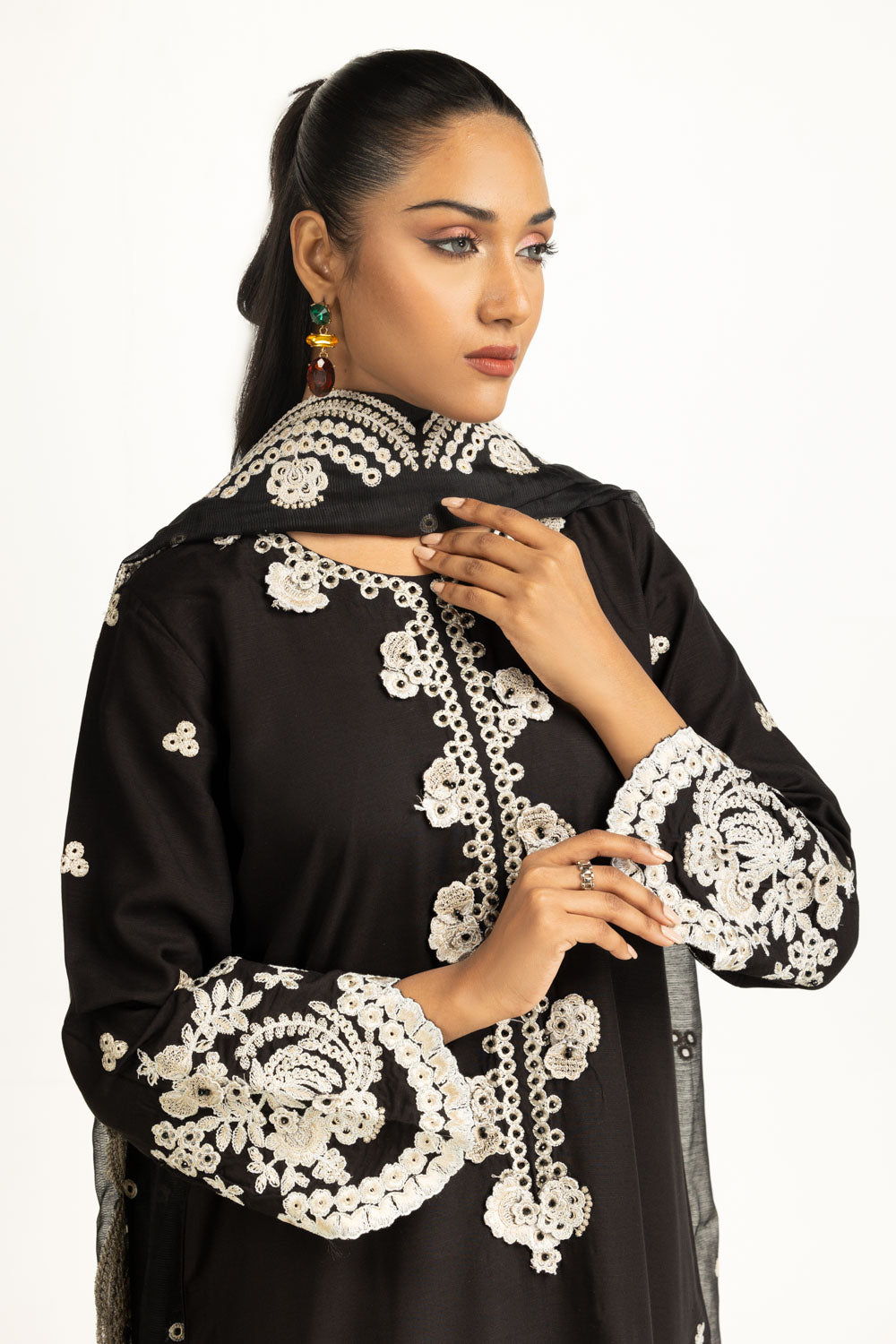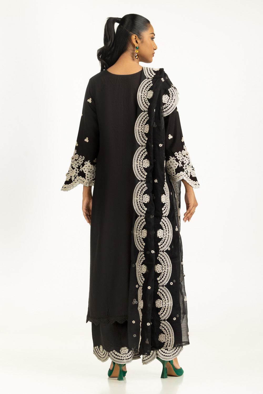 This embroidered suit in black embodies festive refinement through its intricate threadwork and graceful drape. The fabric soft feel and gentle flow lend a regal charm, while the regular fit keeps it wearable and flattering. A timeless choice for winter gatherings and special occasions.