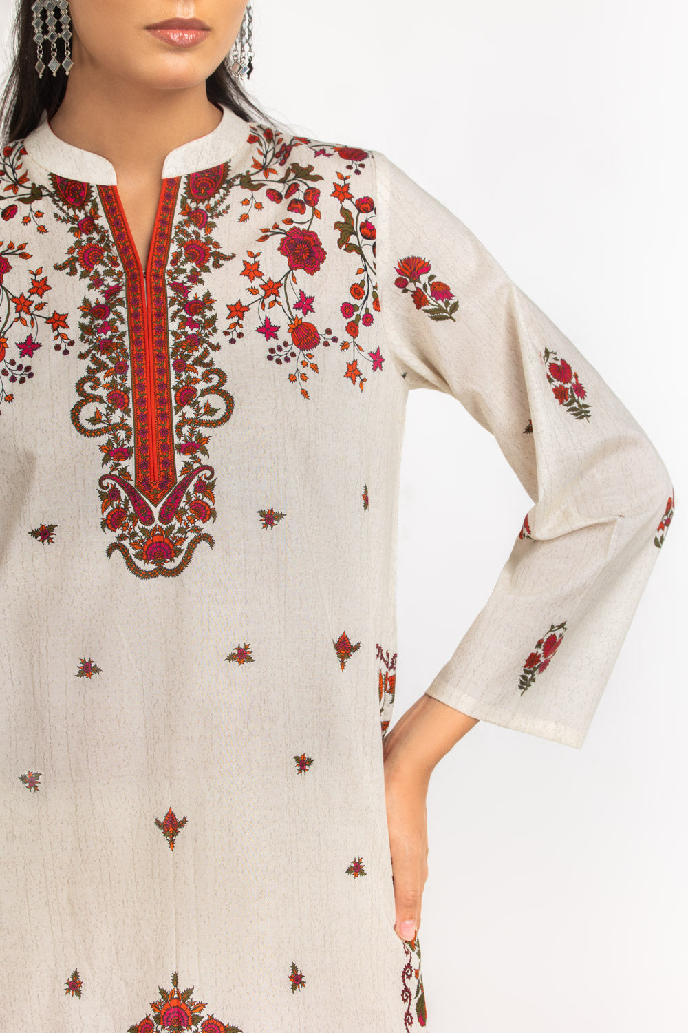 A balanced of comfort and style defines this beautiful floral printed 3-piece suit. The regular fit tailoring ensures ease of movement throughout the day. Paired with beautifully coordinated scarf in a vibrant hue, for enhanced look. Perfect for casual lunches and relaxed gatherings.