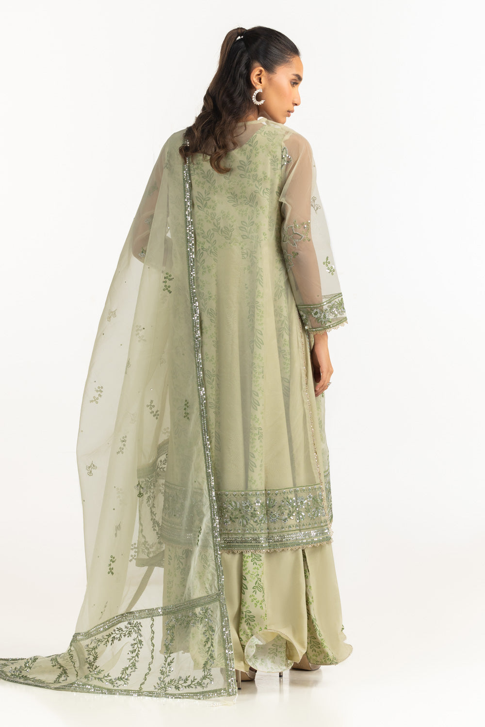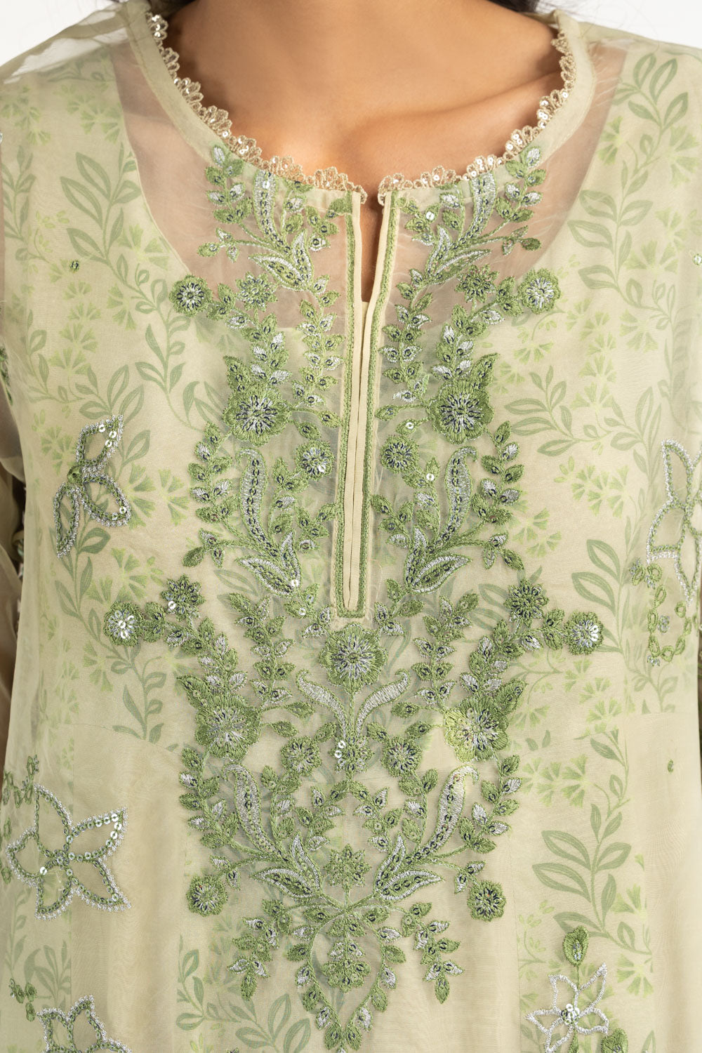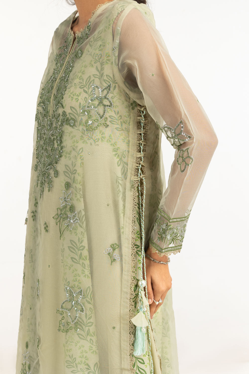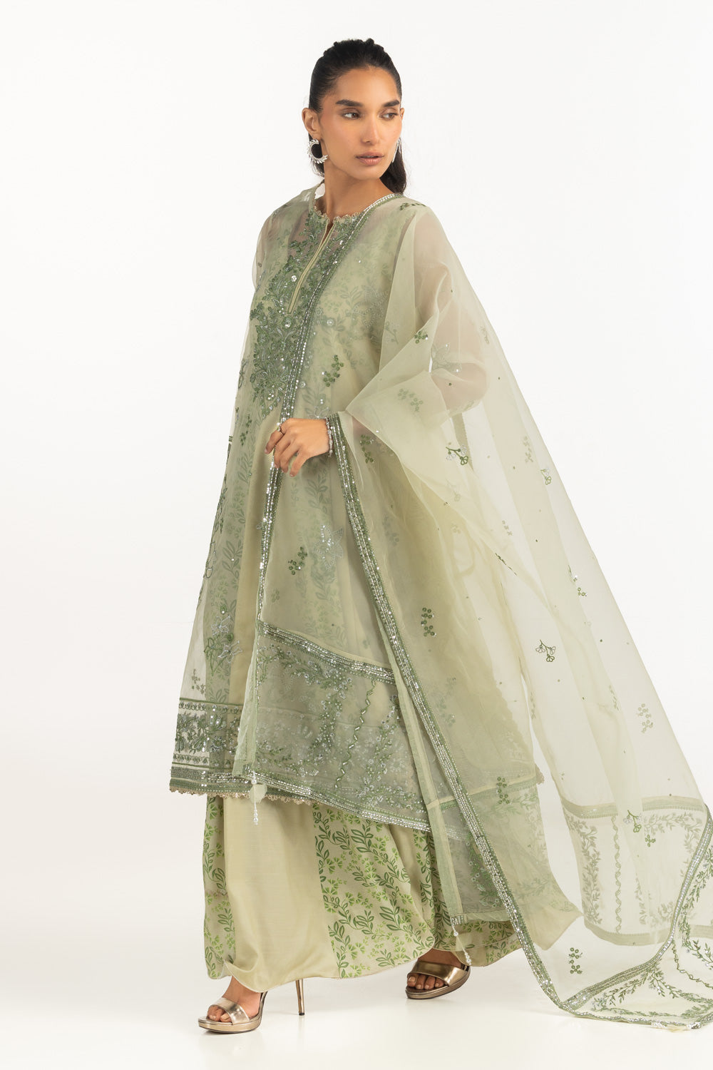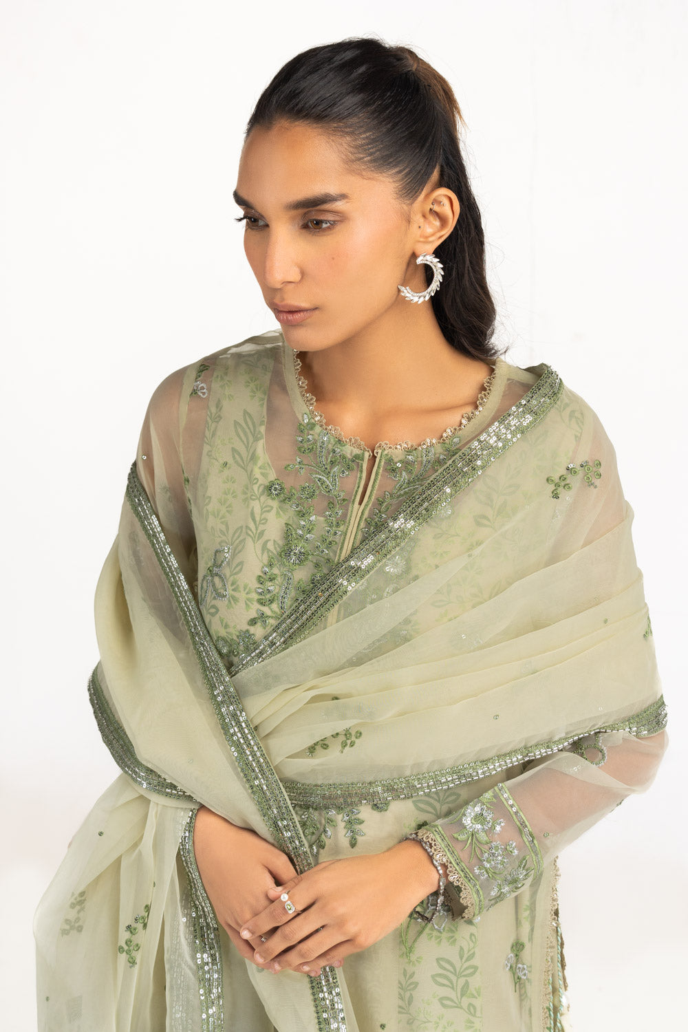 Shimmering sequins scattered across sheer organza bring festive sparkle to this elegant ensemble. The printed raw-silk inner adds modest layering while the embroidered dupatta completes the refined look. Designed in a regular fit, it’s a graceful outfit for lunches, small celebrations, and daytime events.