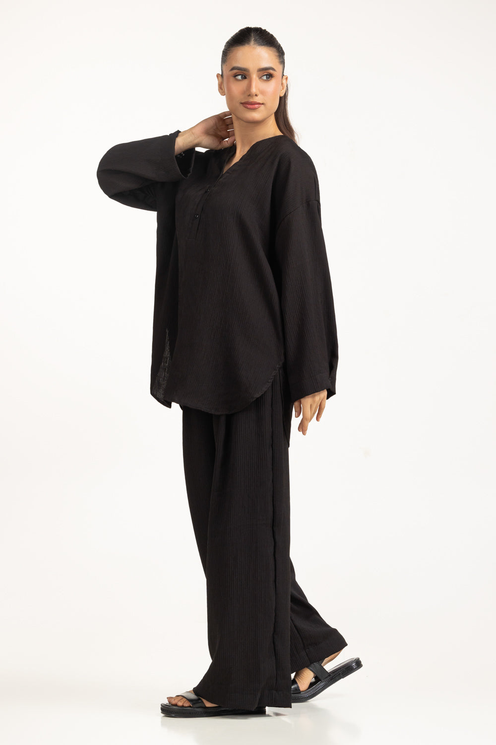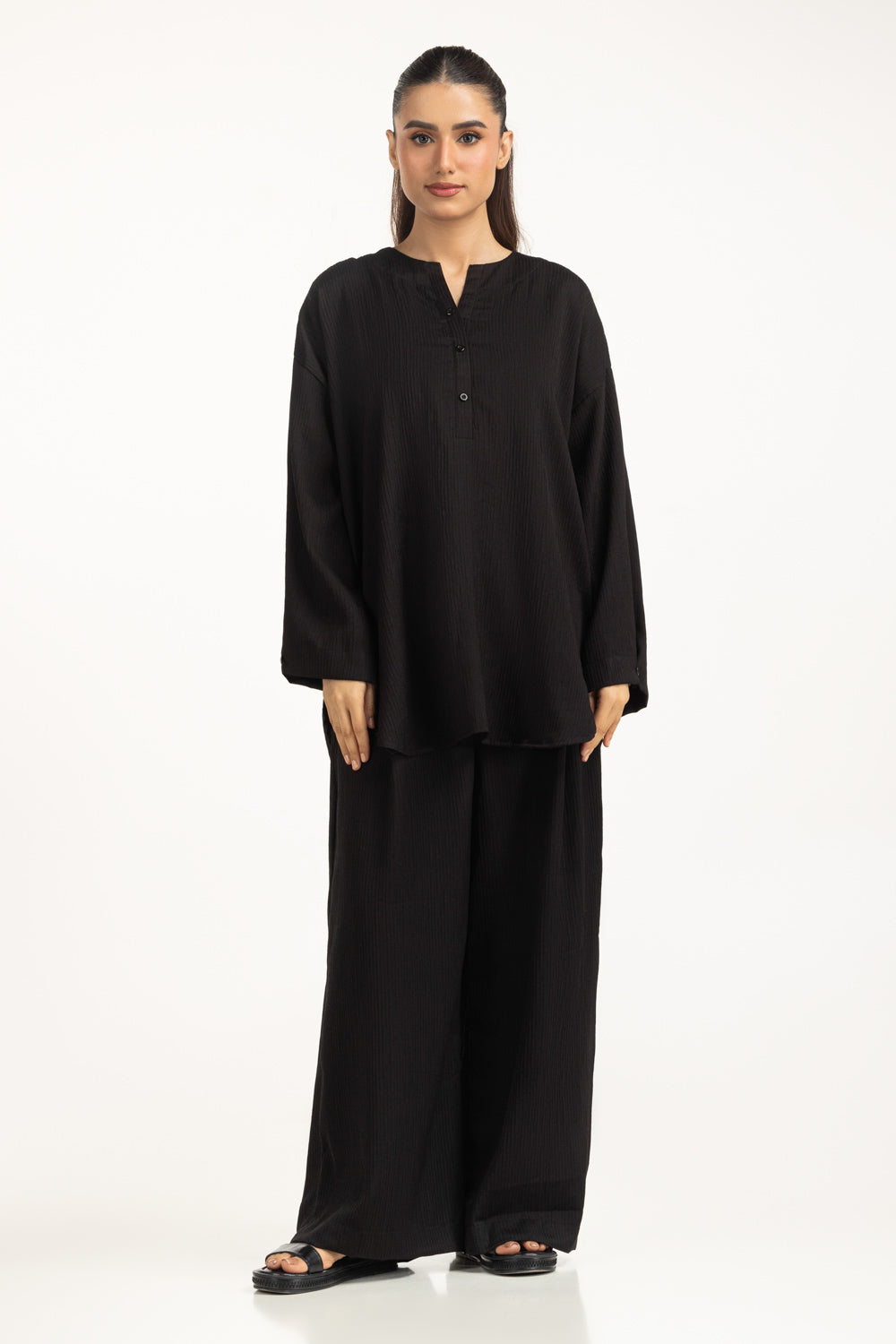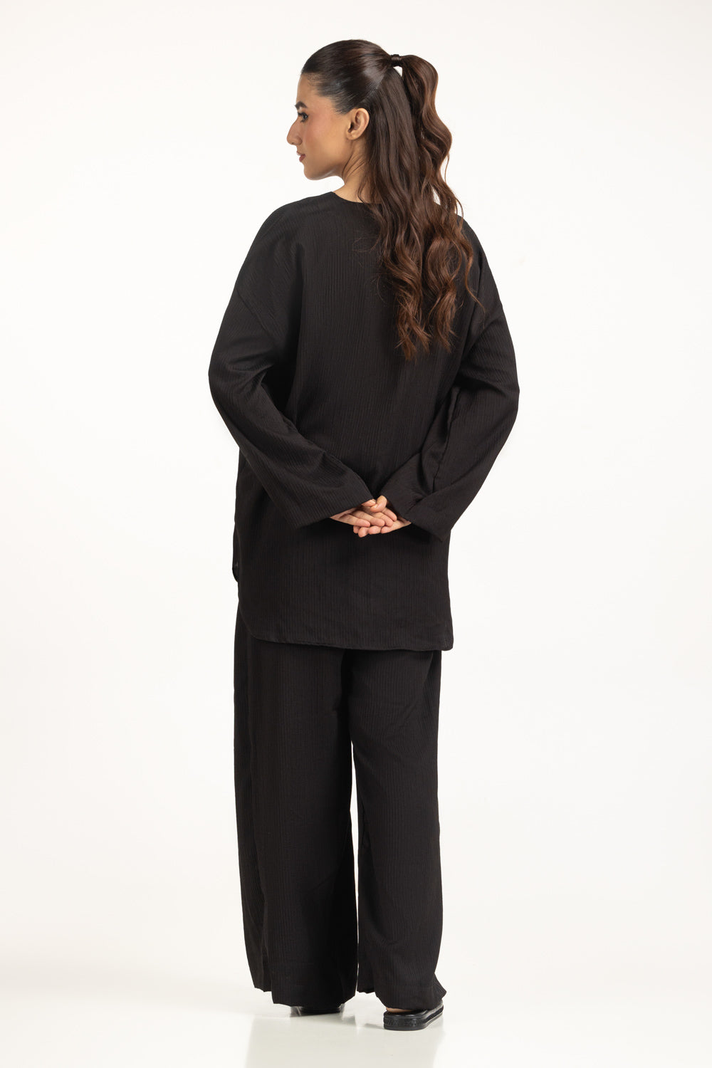 The textured fabric in deep black brings depth to this contemporary winter essential. Featuring a round neckline with neatly placed buttons, it speaks of refined minimalism. Functional yet chic, it pairs effortlessly with the matching trousers for the everyday casual look.