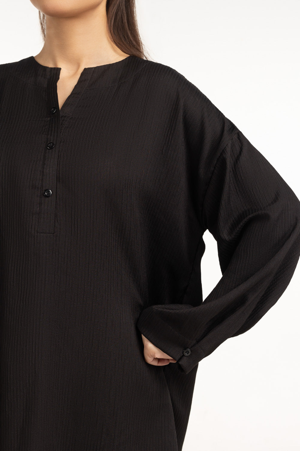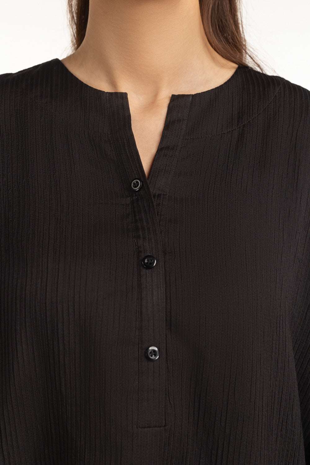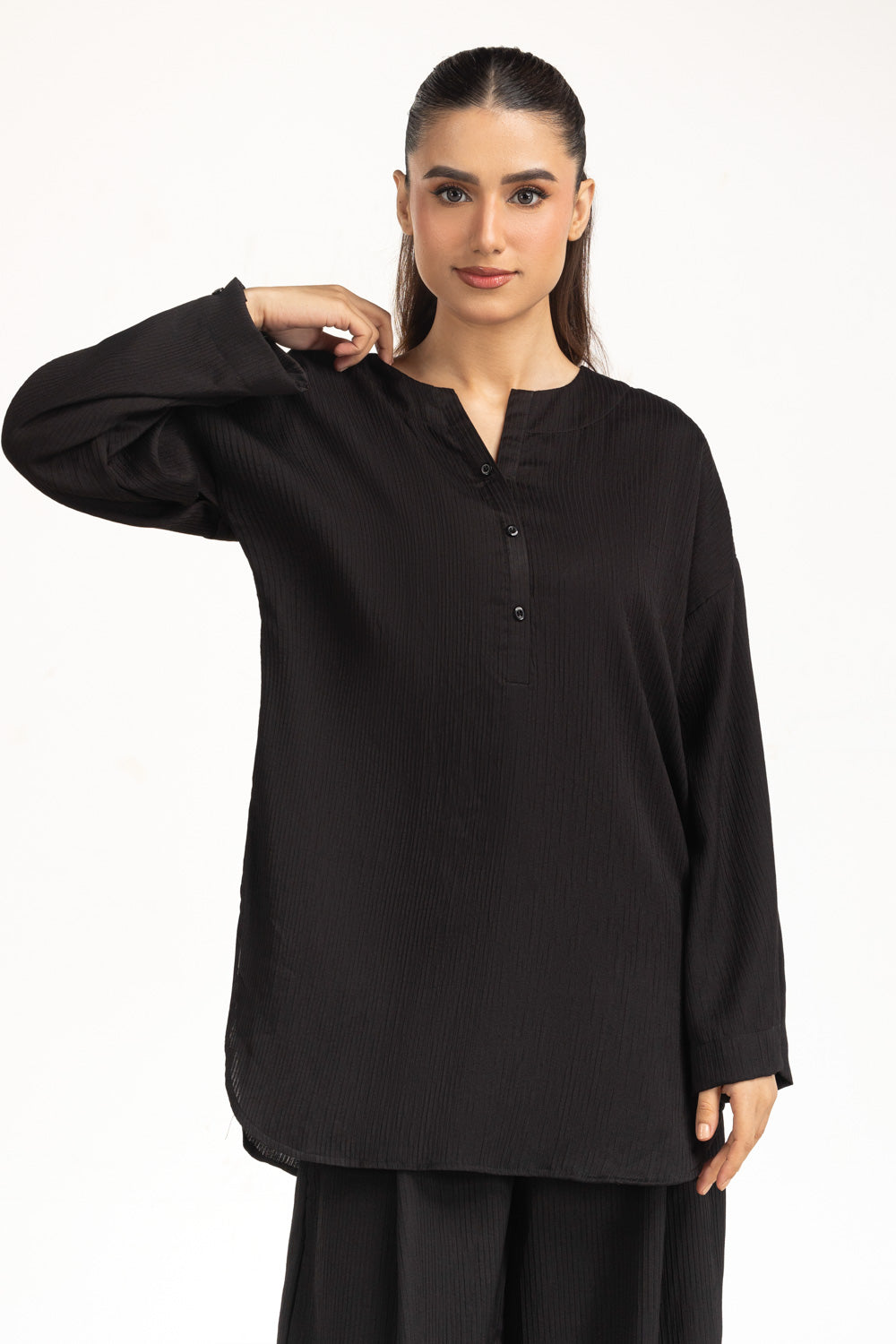 The textured fabric in deep black brings depth to this contemporary winter essential. Featuring a round neckline with neatly placed buttons, it speaks of refined minimalism. Functional yet chic, it pairs effortlessly with the matching trousers for the everyday casual look.