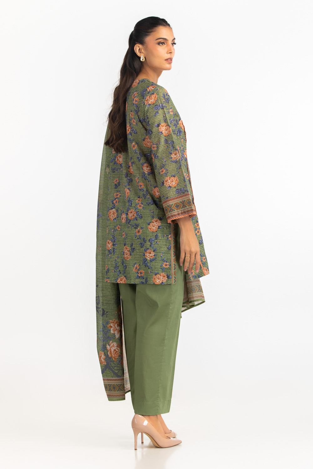 A refreshing take on traditional summer wear, this floral printed lawn suit brings ease and grace to daily dressing. The airy loose shirt creates a light silhouette while the plain dyed trouser keeps the overall look neat and contemporary. Ideal for casual outings and friendly gatherings, it blends comfort with feminine style.