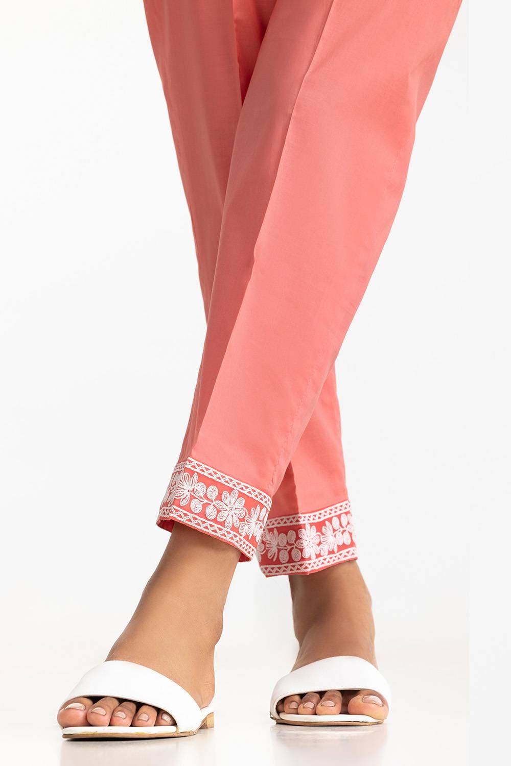 Ready to wear This orange2PC suit features a boat neckline, geometric embroidery, and lace accents on full sleeves. Paired with sleek trouser, it's ideal for festive occasions.