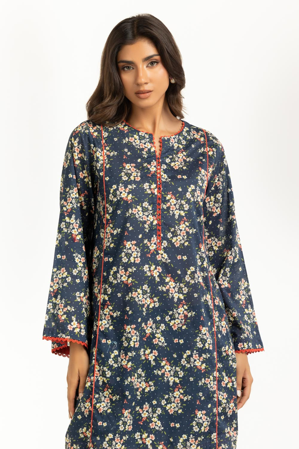 Details: Printed Co-ord featuring a Round-Neckline with delicate Lacework.
