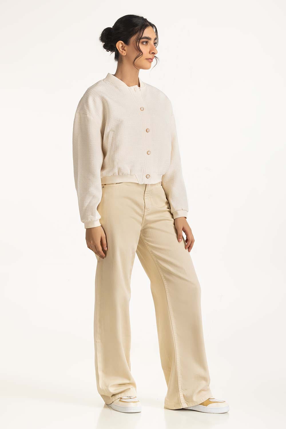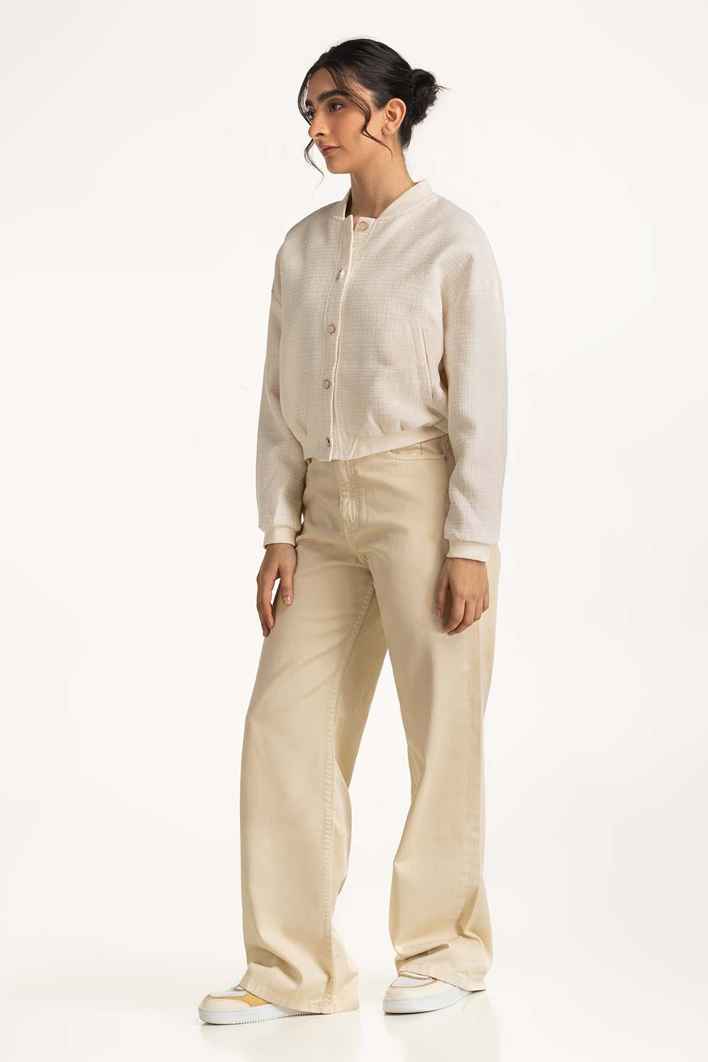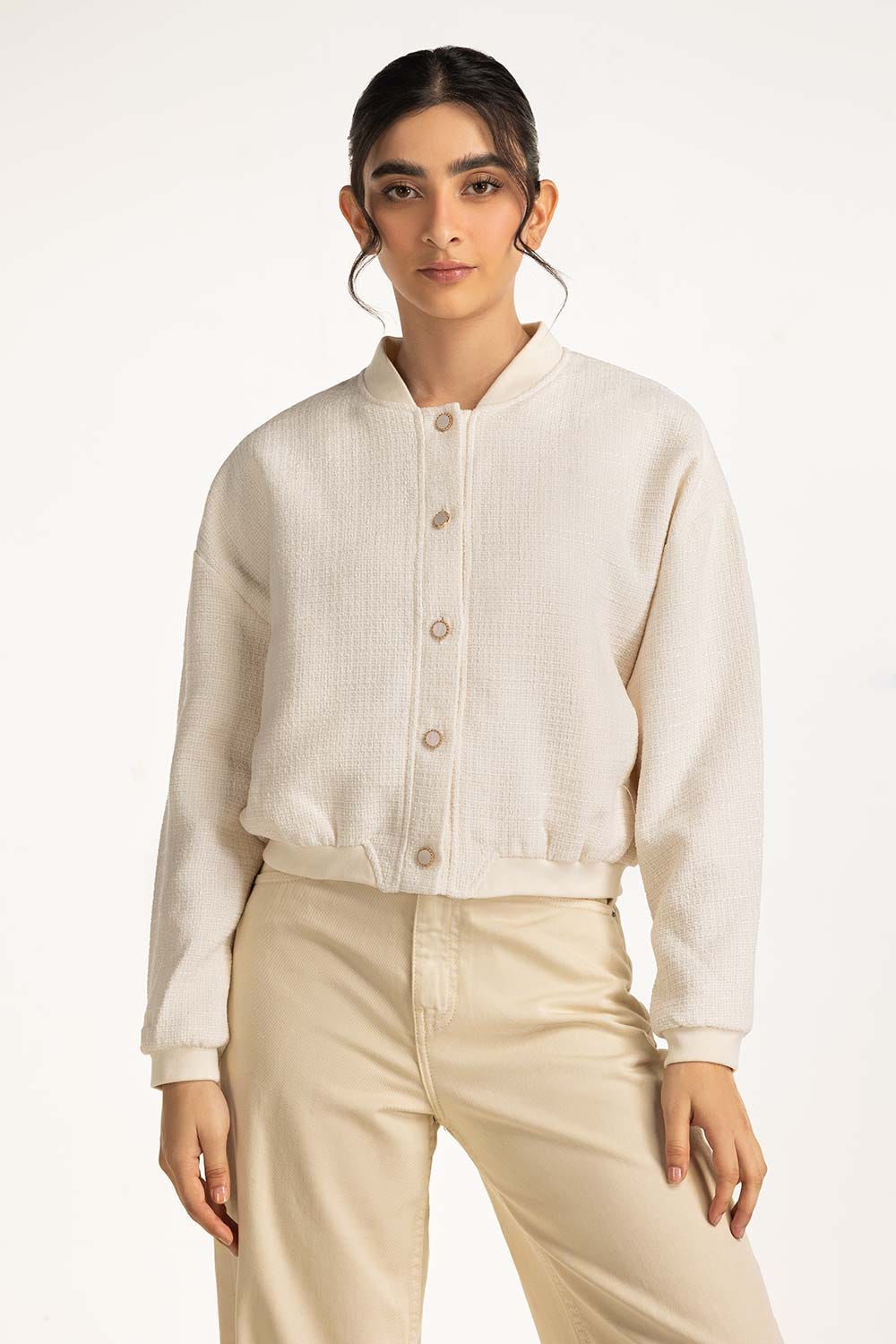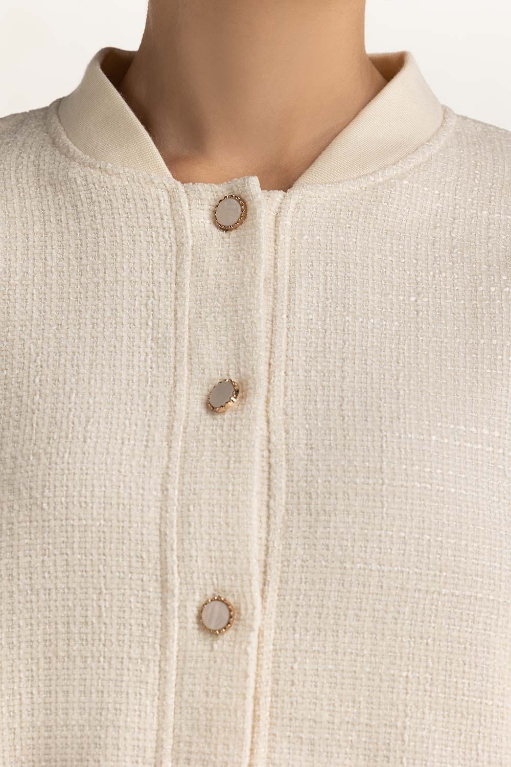 Offwhite cropped length jacket with fancy buttons front and rib at bottom