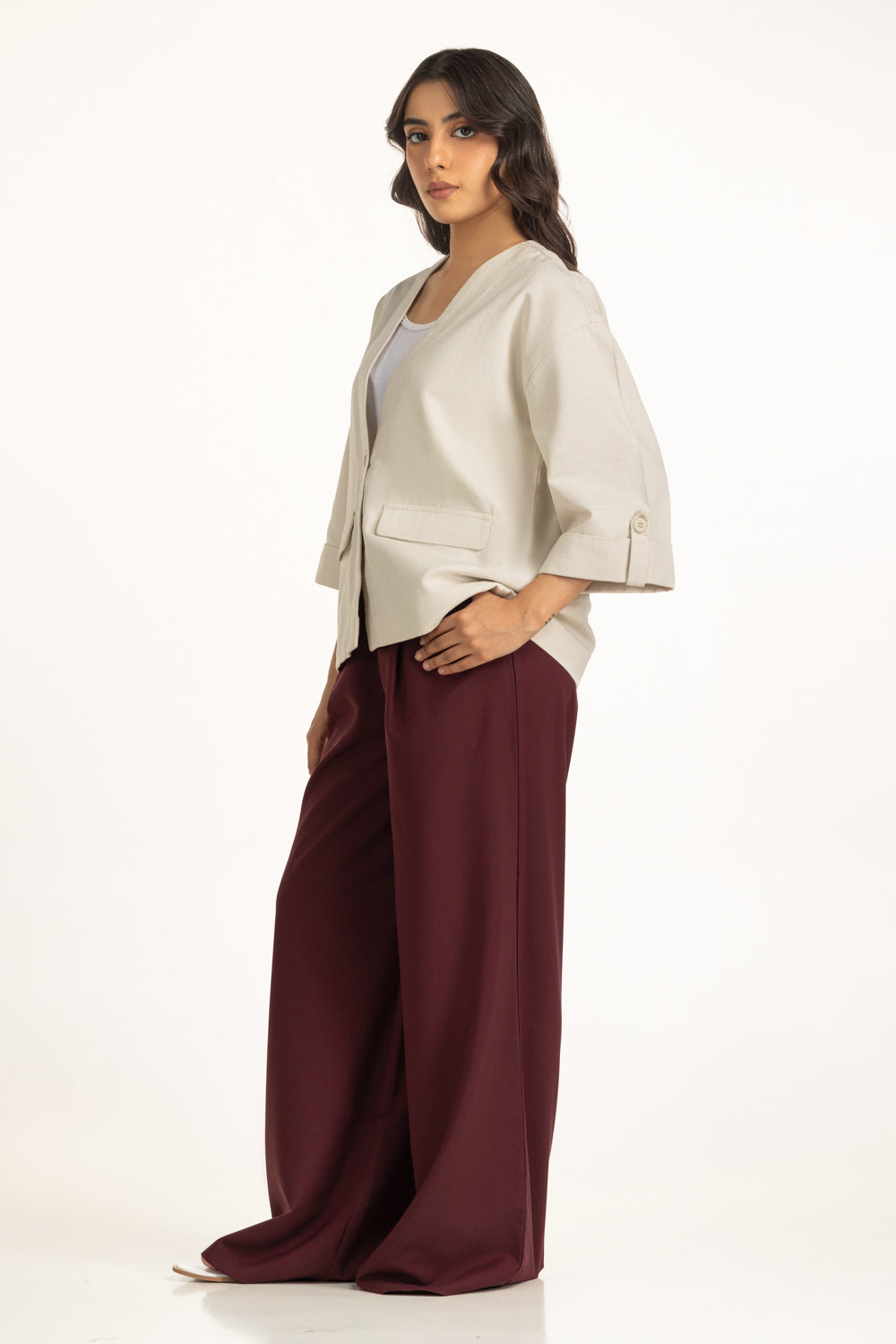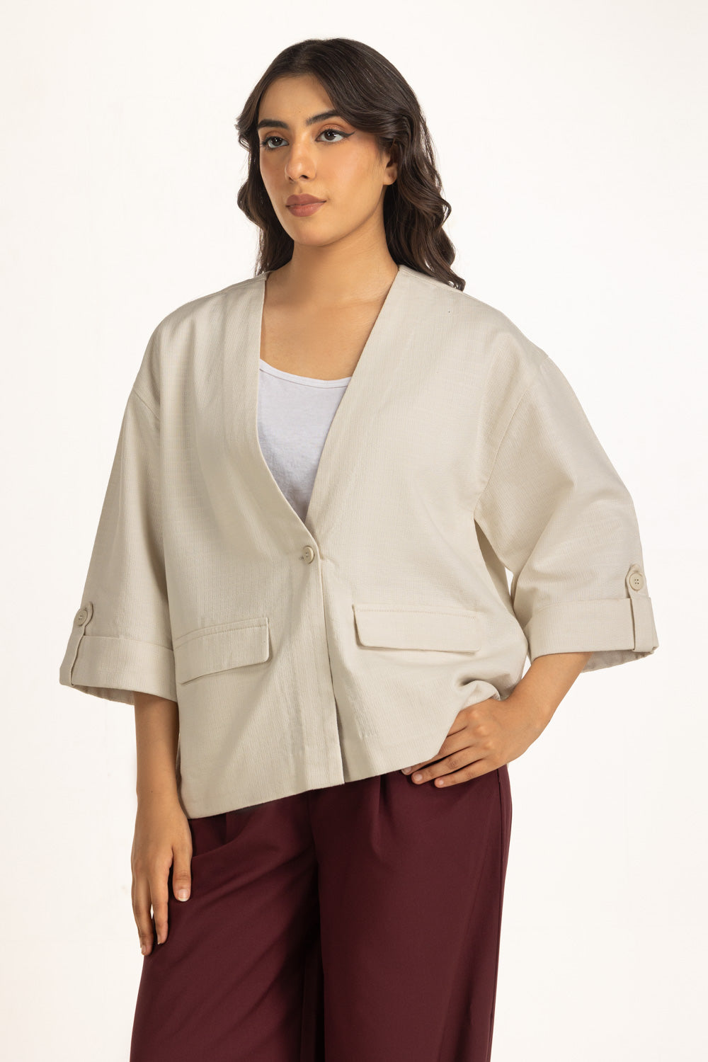 A fresh neutral for the season. This light hued jacket brings elegance to functional winter layering. Crafted from textured cotton, it offers a gentle structure, while the V-neckline and button-down closure keep it sleek and versatile for everyday styling.