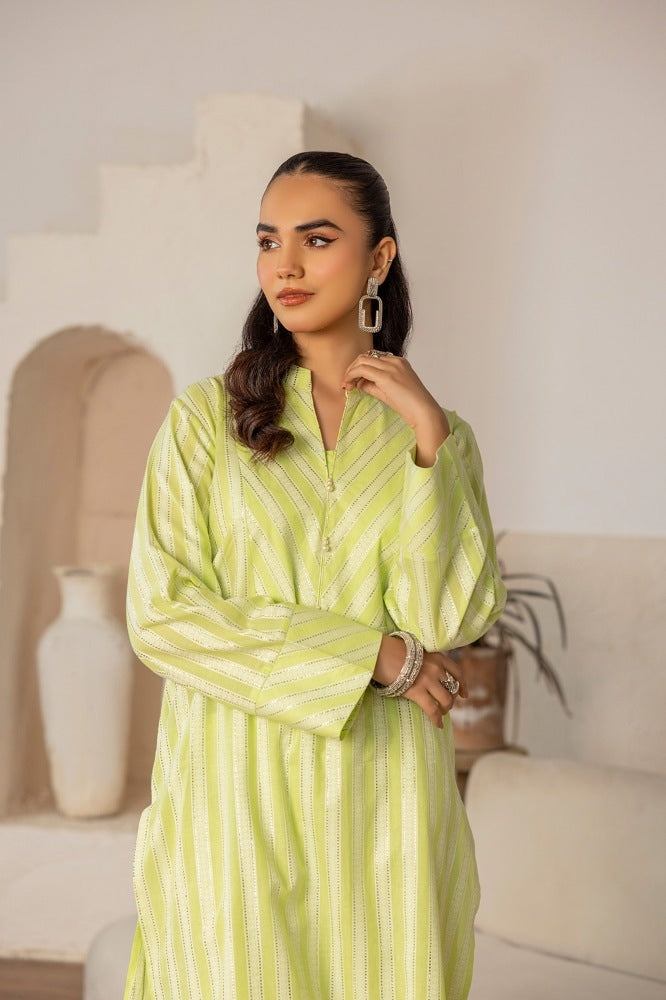 Ready to wear 2Pc lurex jacquard shirt and dyed cambric Trouser with neck handwork.