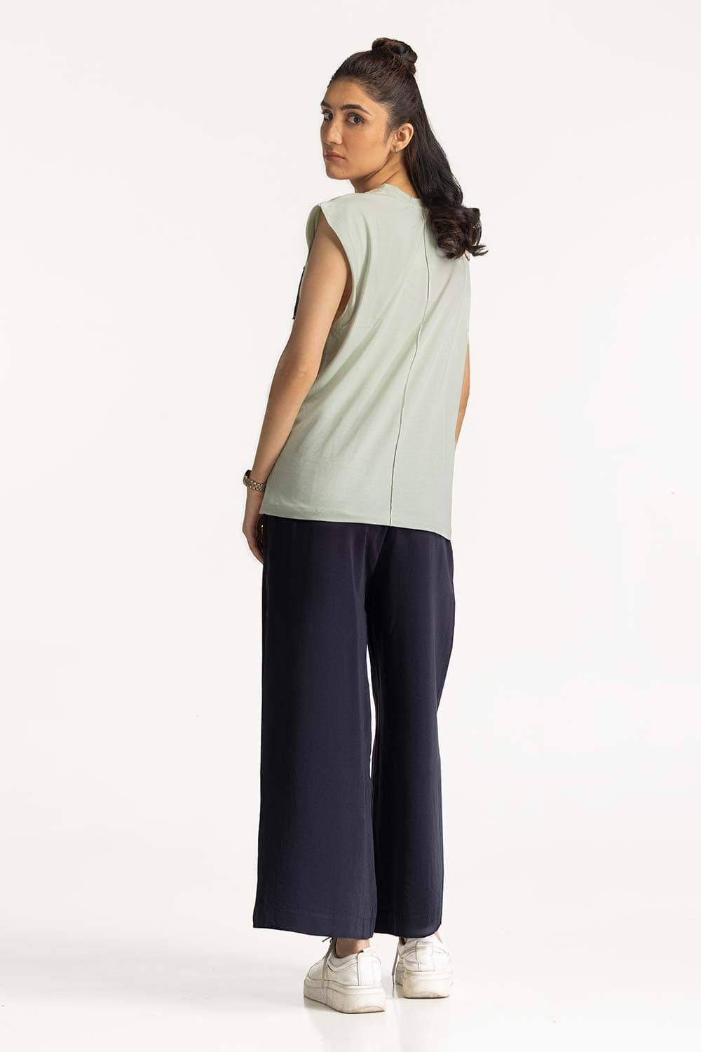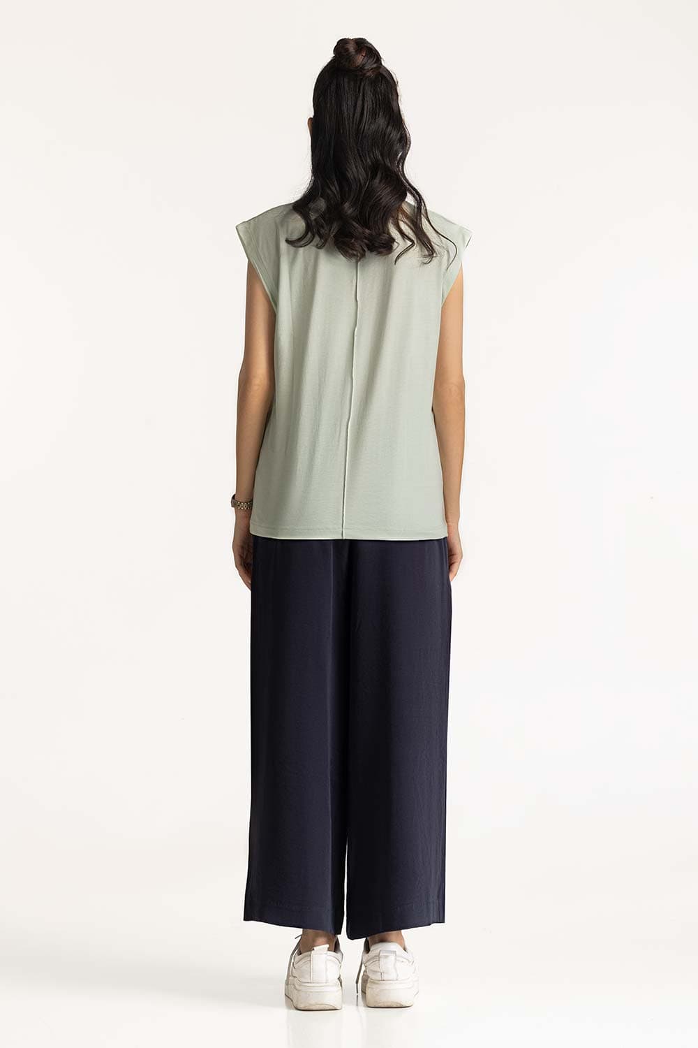 Crew neck tee. Ribbed trim and neck and armhole with center pleat detail at back. Artwork patch on side front.