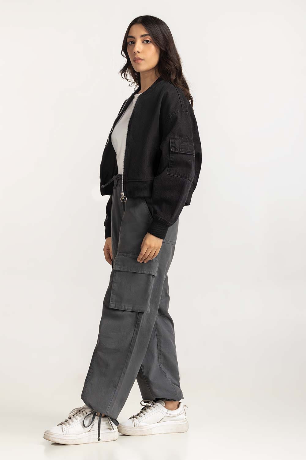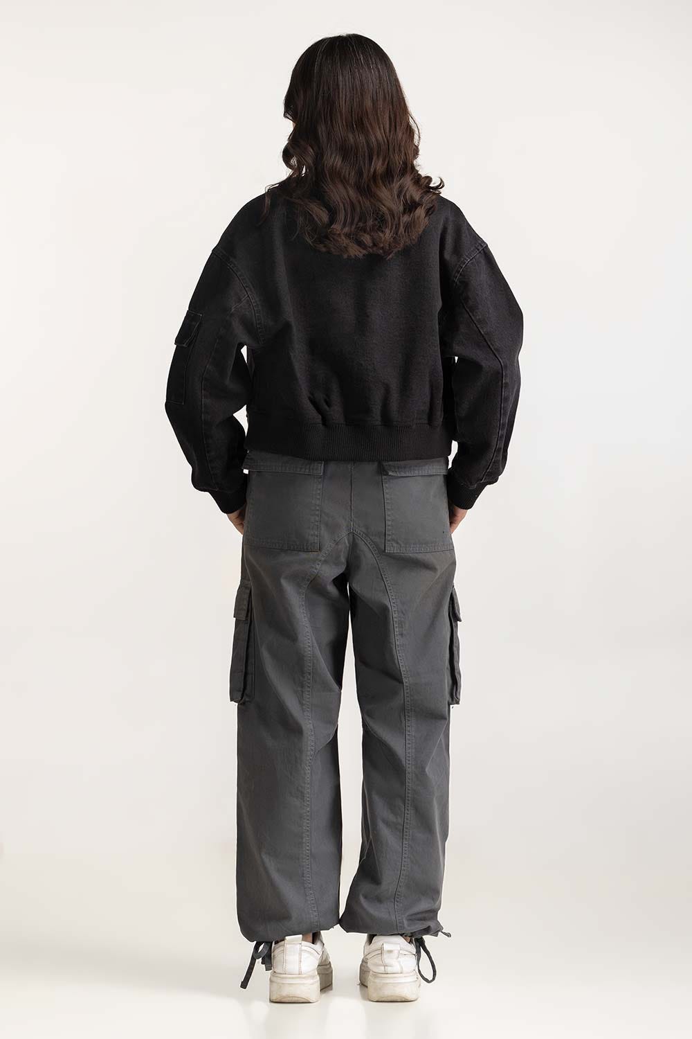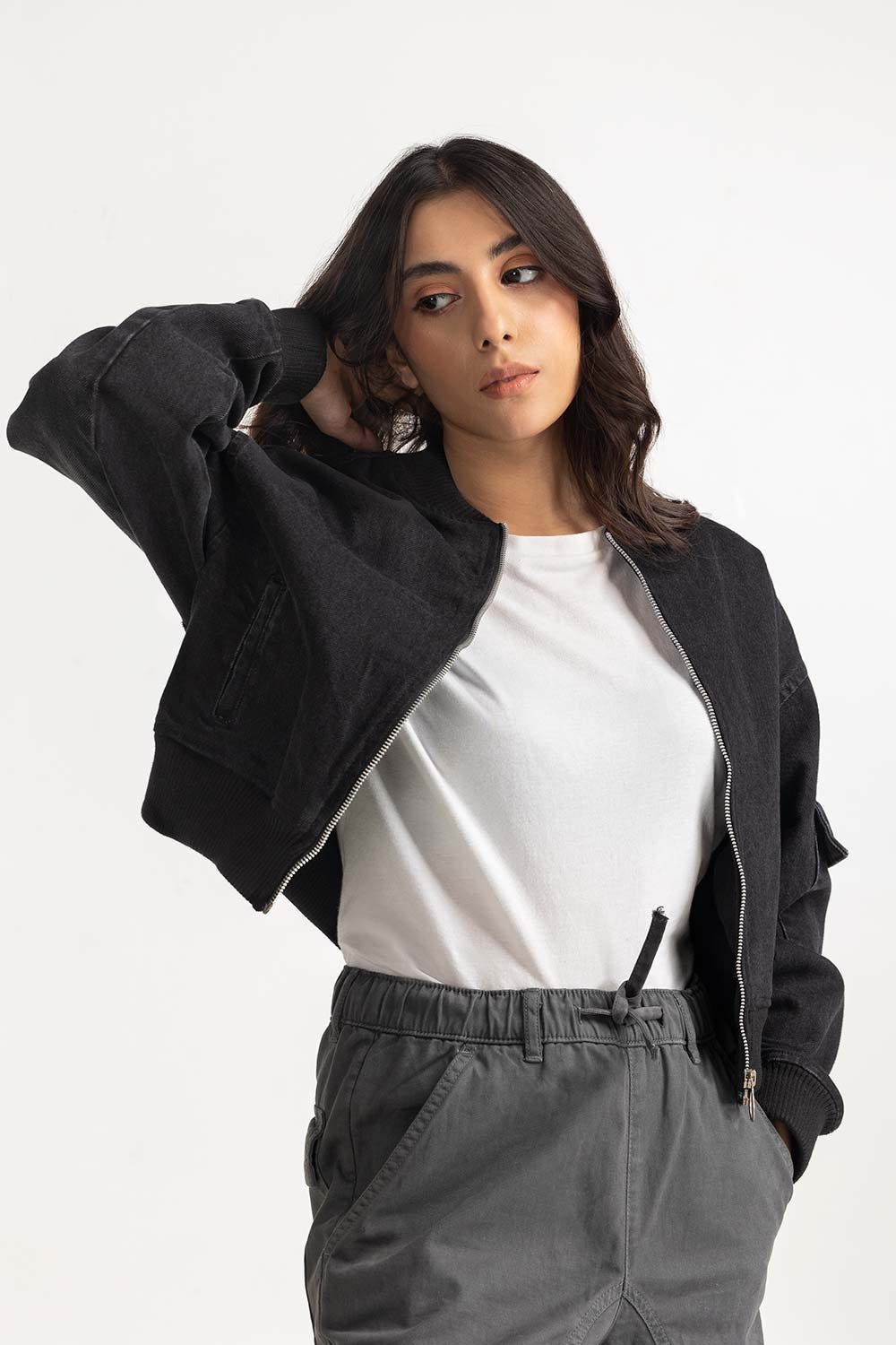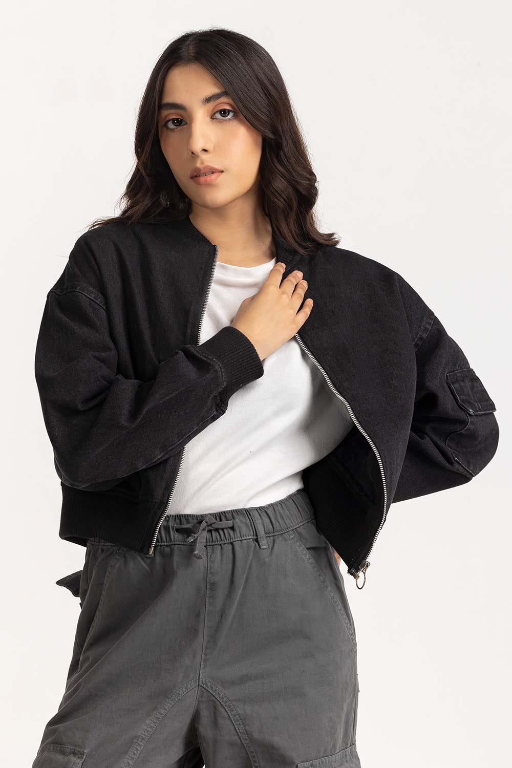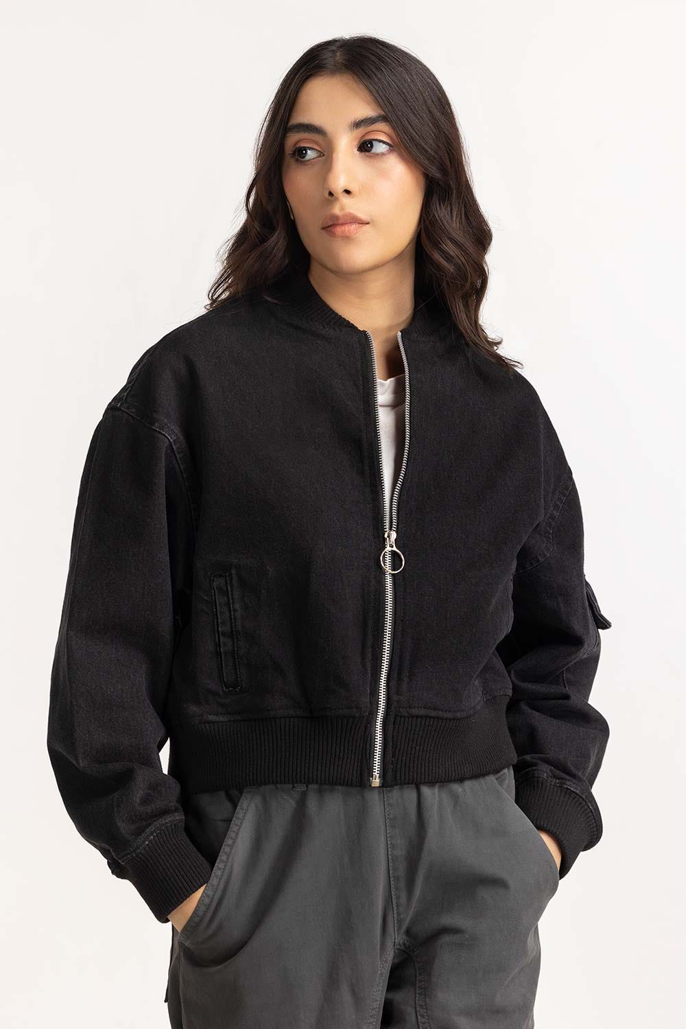 Denim Bomber Jacket With Front Zipper Closure Detail