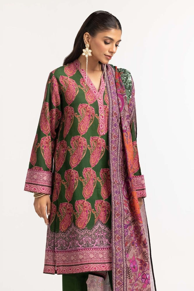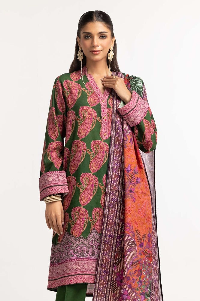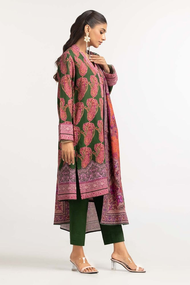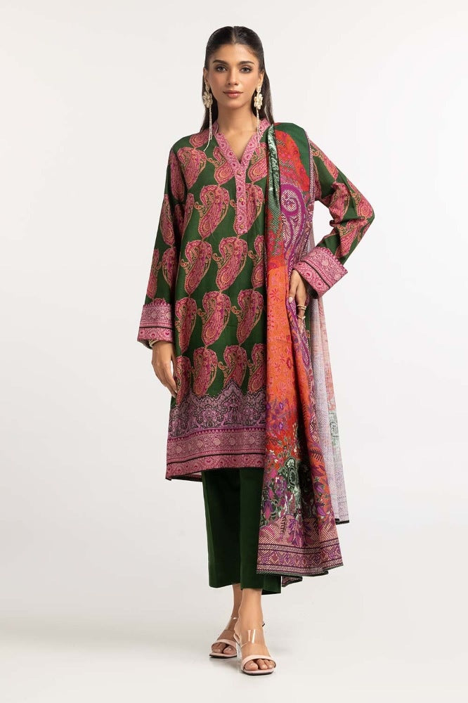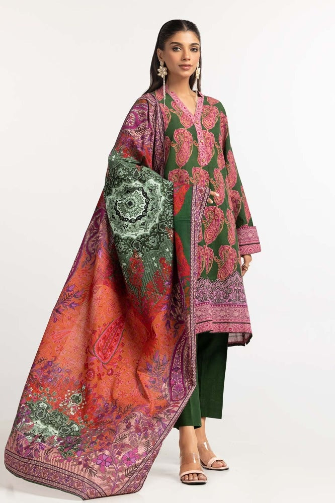 Ready to wear Digital Print Khaddar Shirt with a V-collar, Printed Dupatta and a plain khaddar Trouser.