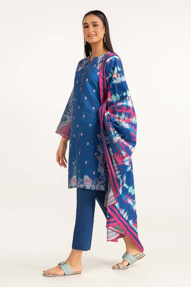 Digital Print Khaddar Suit with small length shirt in a simple neckline following by pipen and round buttons. The Dyed plain trouser with a Khaddae Duppata.ï"