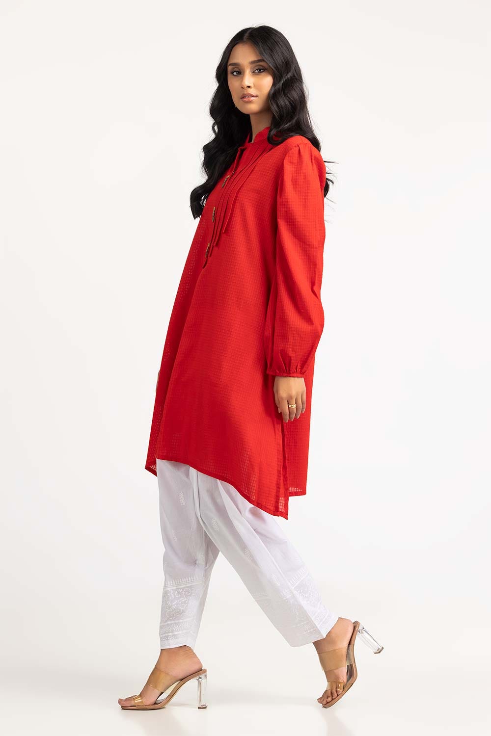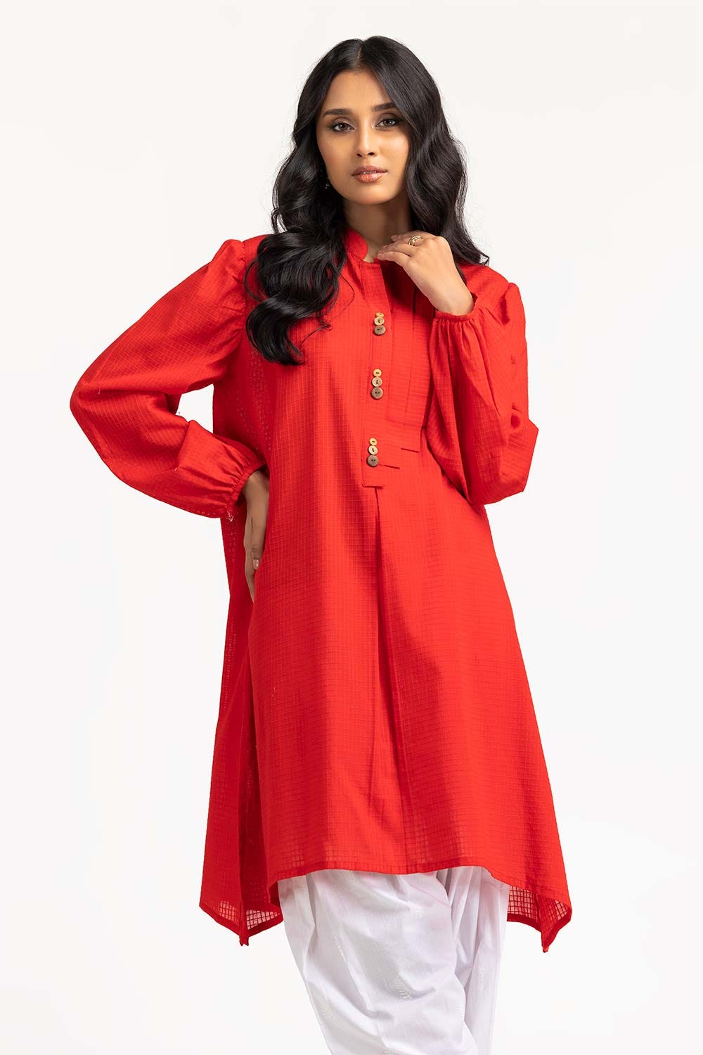 Ready to wear Red dobby A-line shirt featuring a band collar with detailing and gathered sleeves.