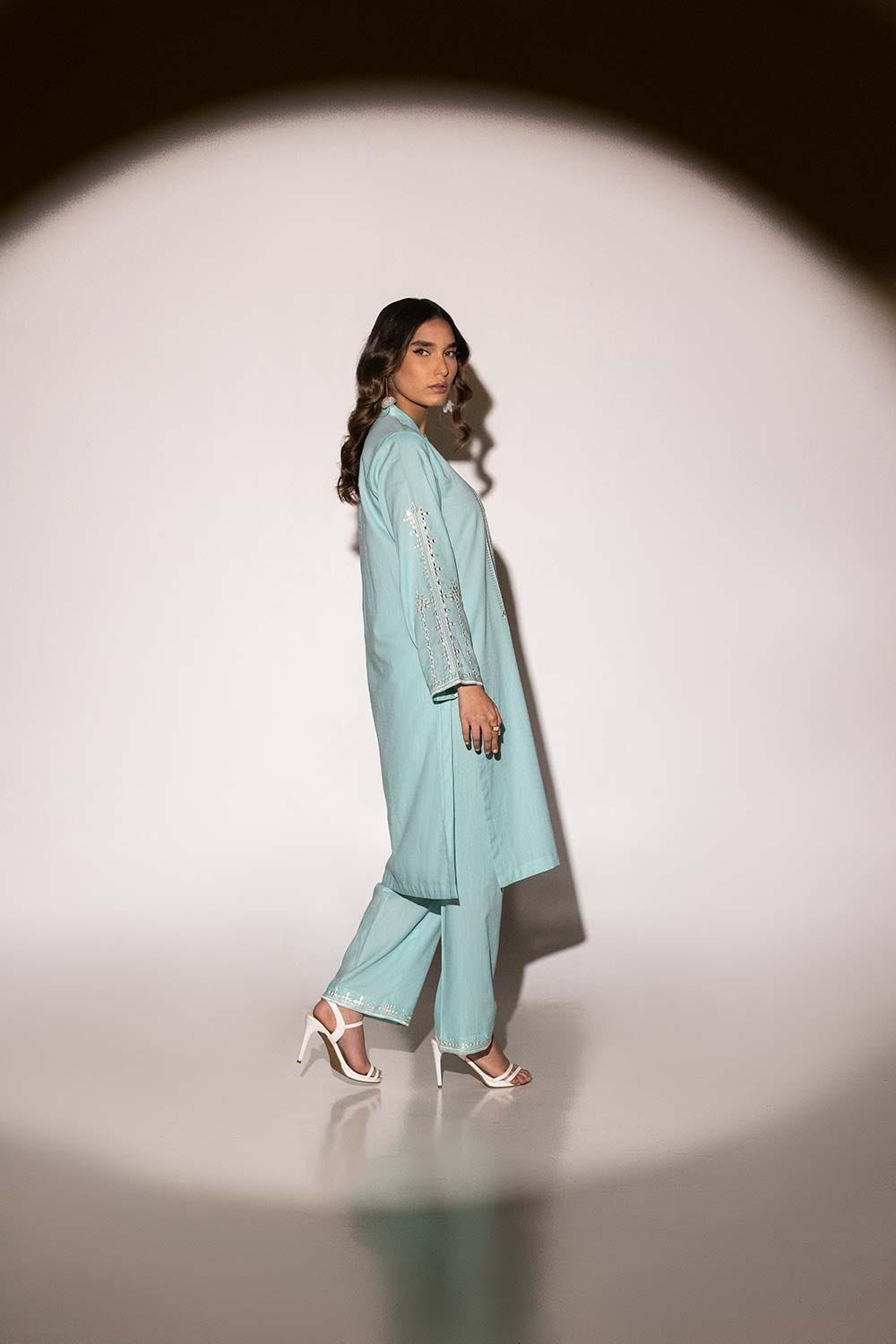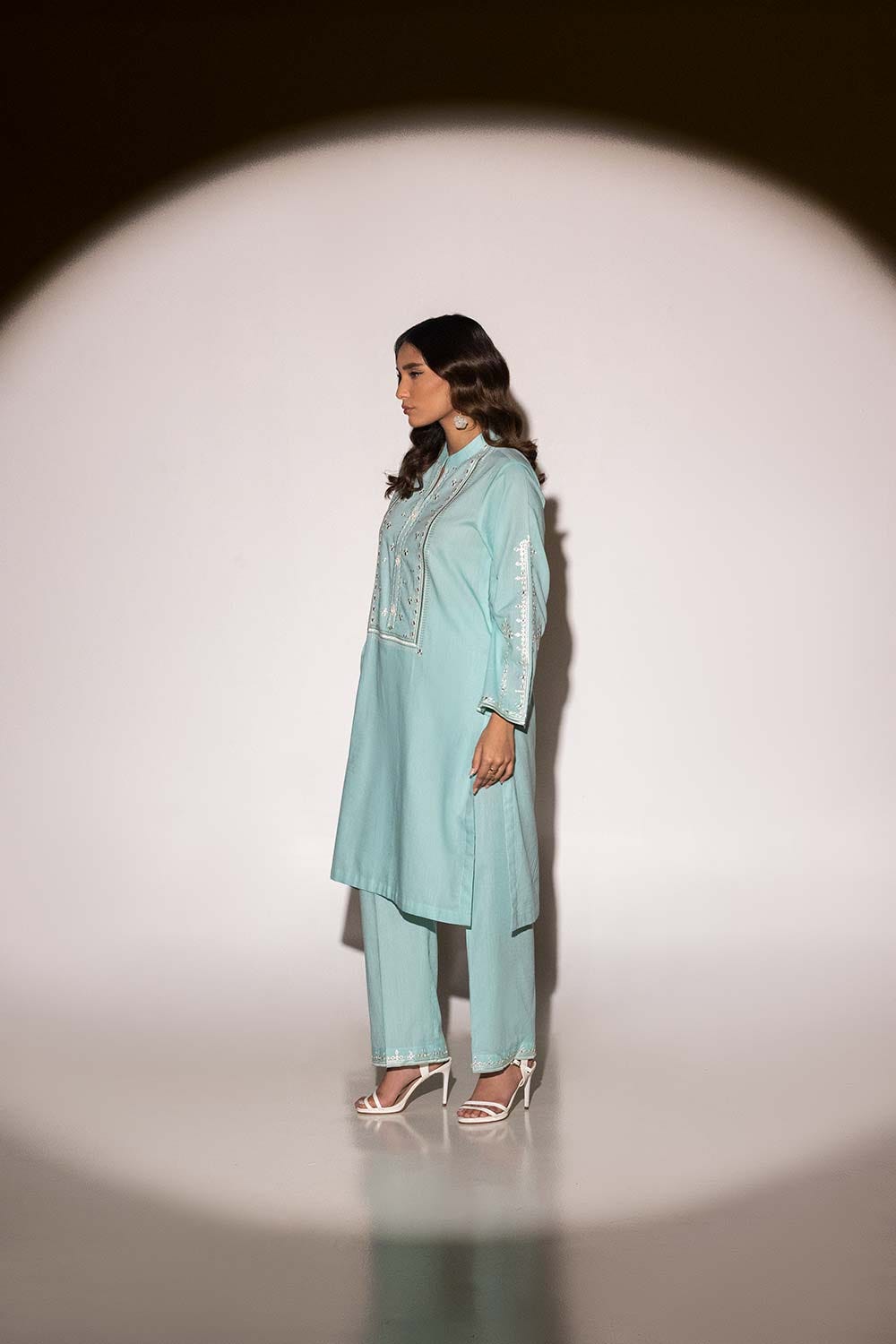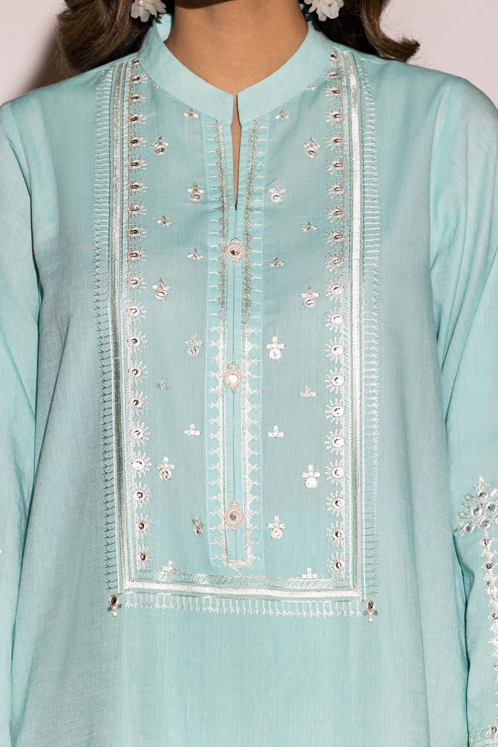 Ready to wear Dobby embroidered shirt with neck handwork and embroidered trouser.