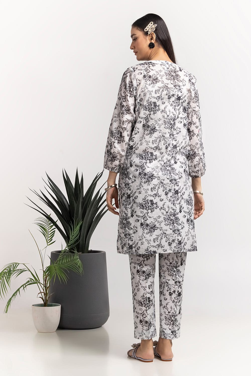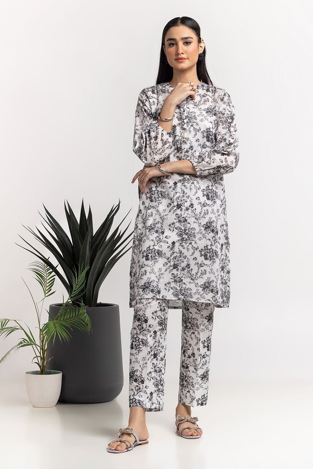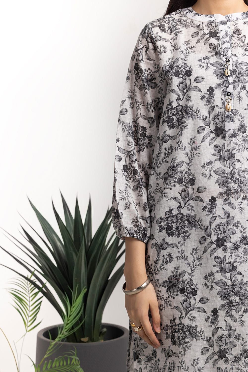 Add elegance to your wardrobe with this 2PC ash grey suit with a round neckline, floral print, full sleeves with contrasting cuffs, and a straight hemline. Paired with matching trousers for a versatile look.