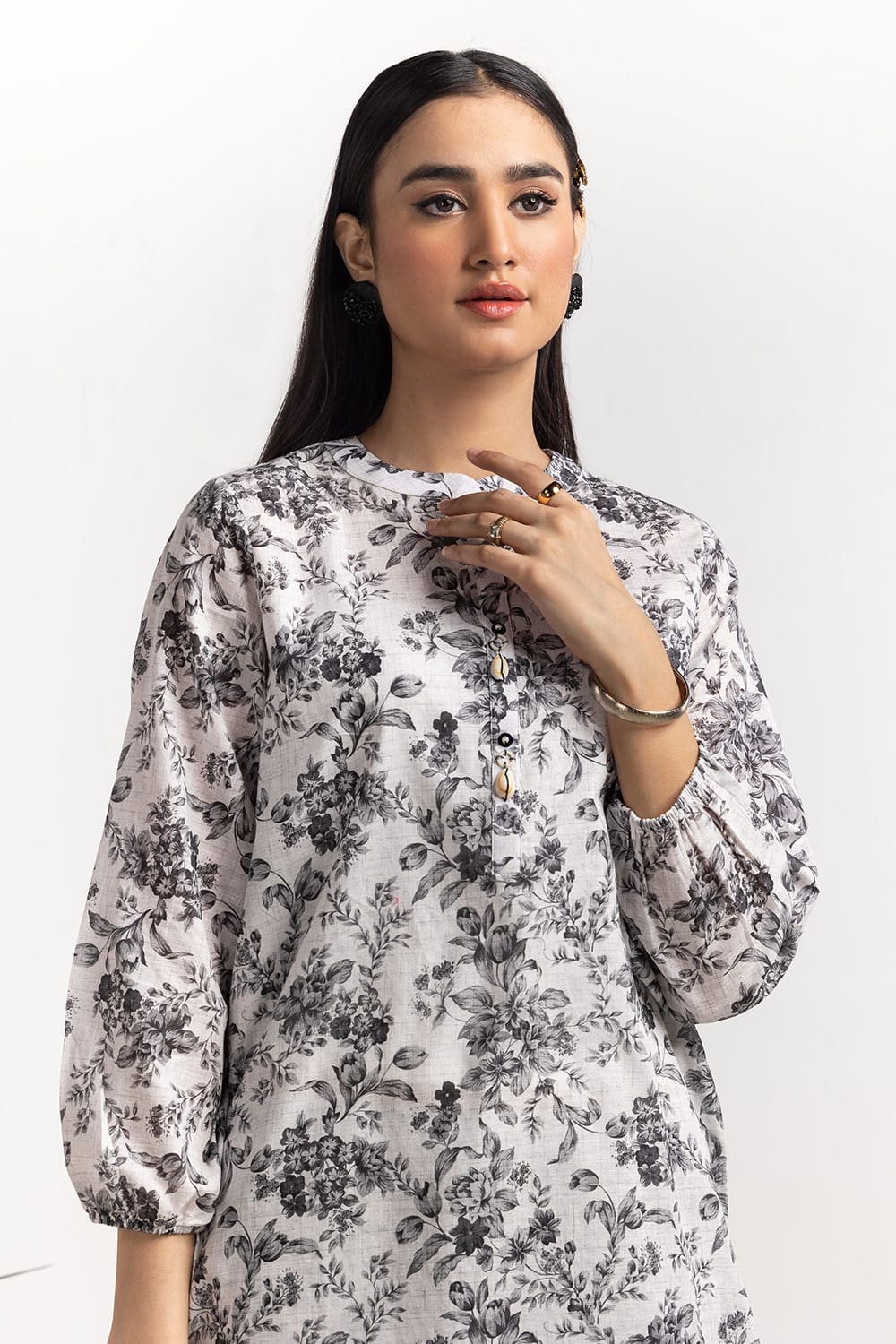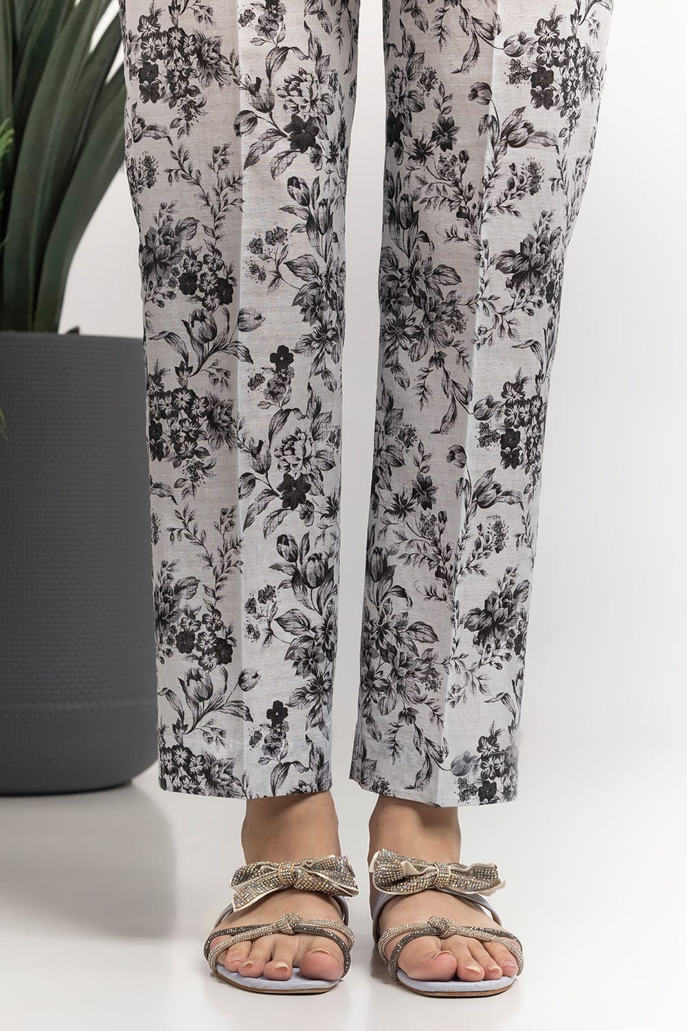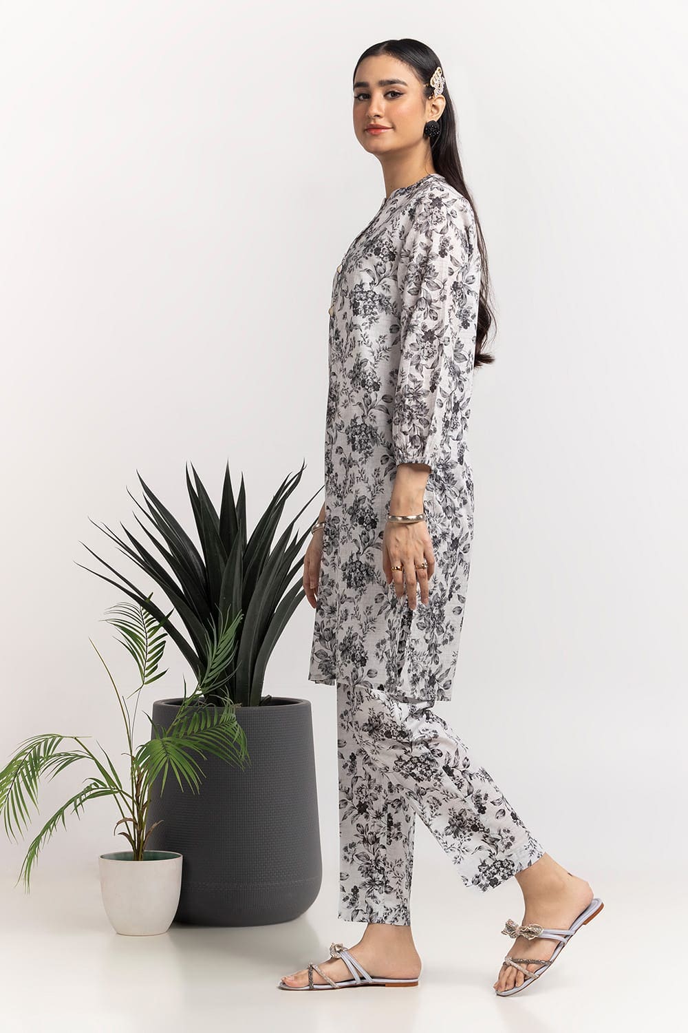 Add elegance to your wardrobe with this 2PC ash grey suit with a round neckline, floral print, full sleeves with contrasting cuffs, and a straight hemline. Paired with matching trousers for a versatile look.
