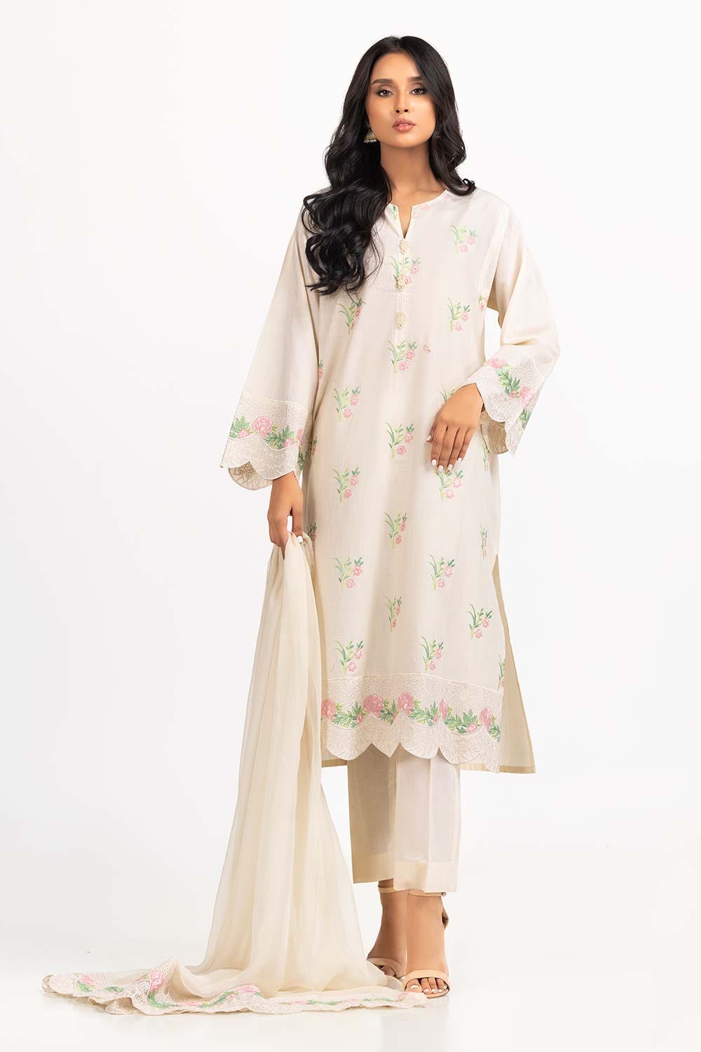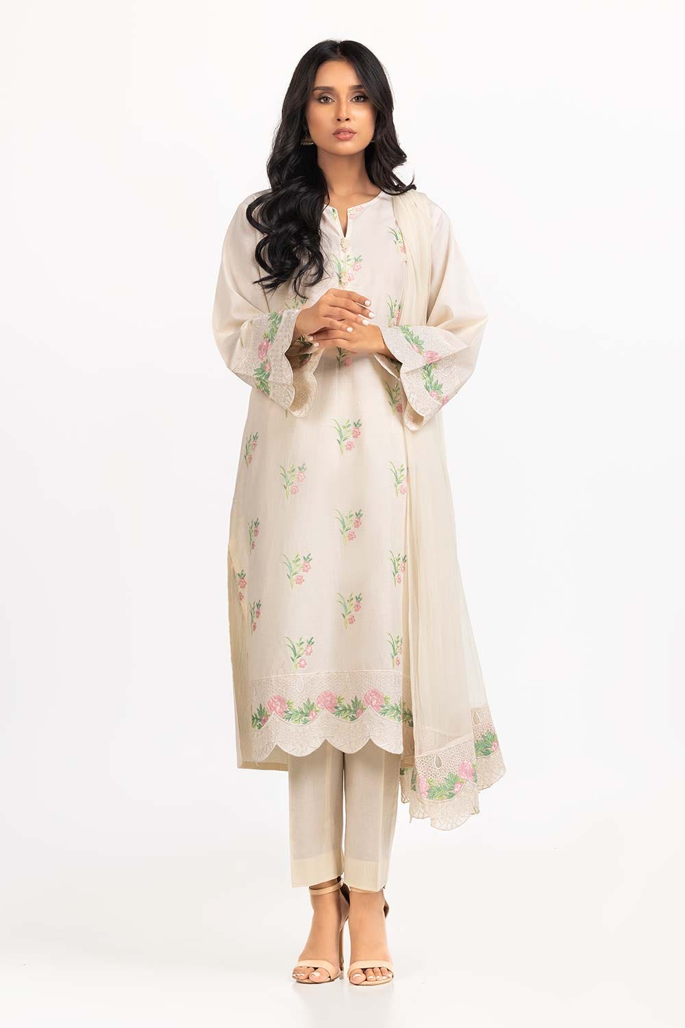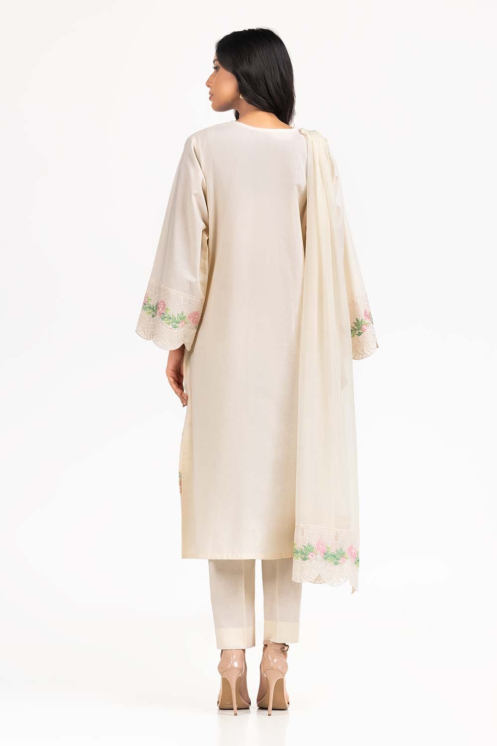 3PC Beige Dyed Cambric Embroidered Suit with round neckline with a V, paired with cambric trouser and chiffoun dupatta.