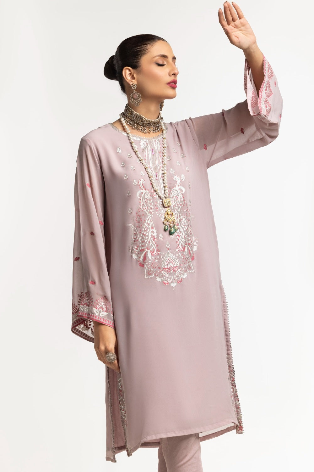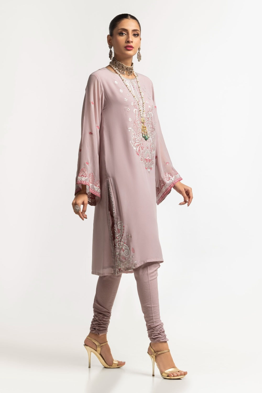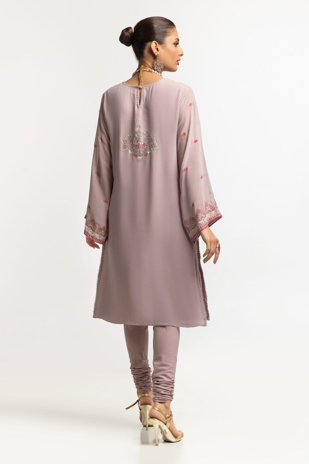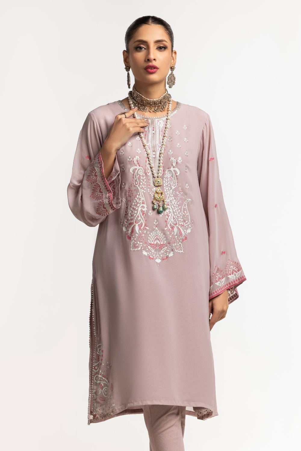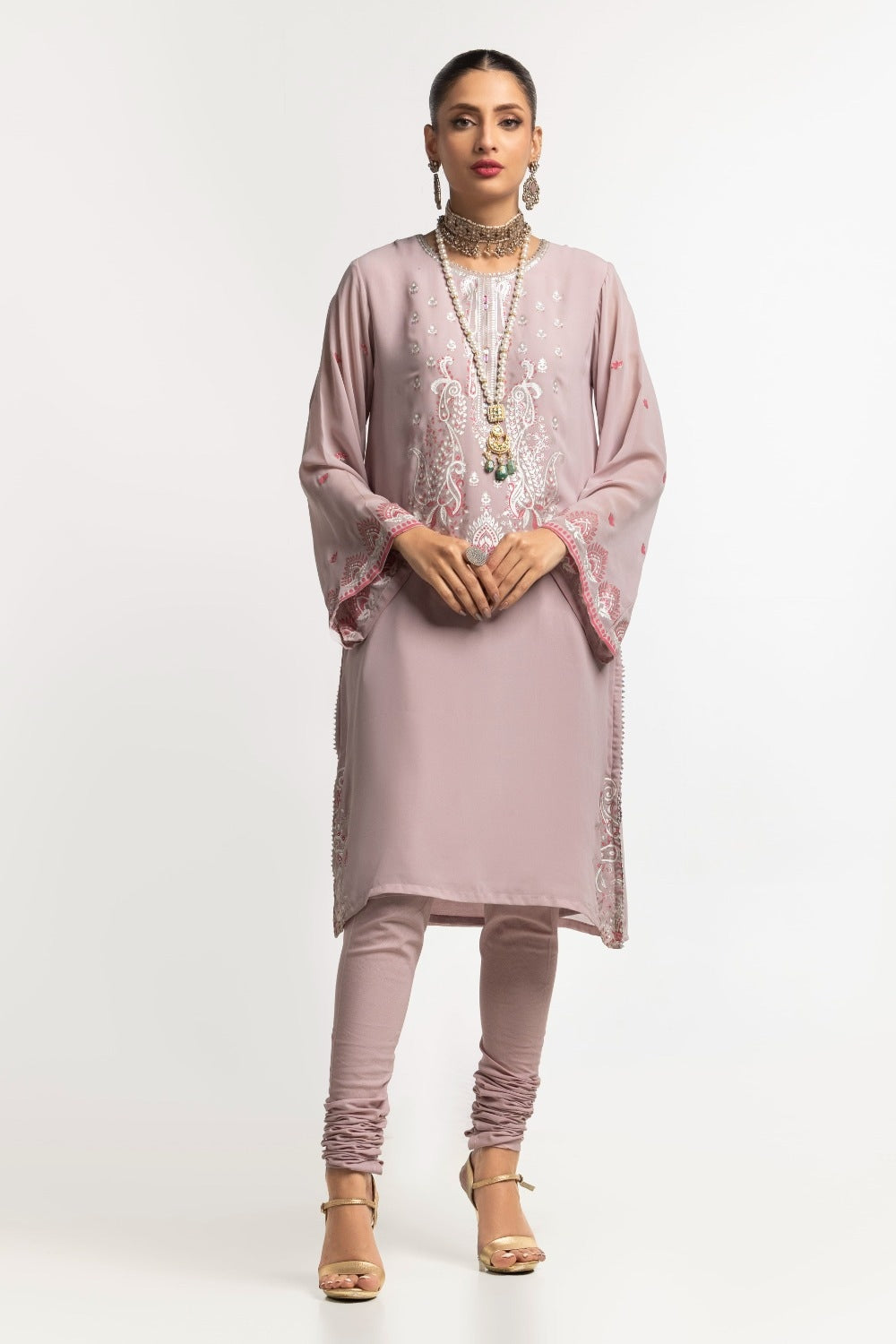 Ready to wear Get indulged in fashion with this light peach-dyed georgette shirt, featuring a round neck, an embellished placket, and foil print on the front, neck, and sleeves.