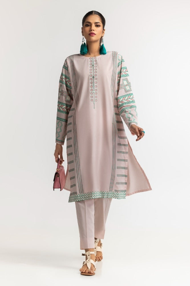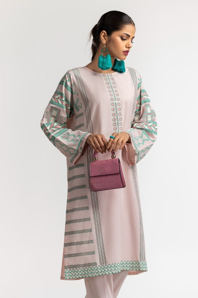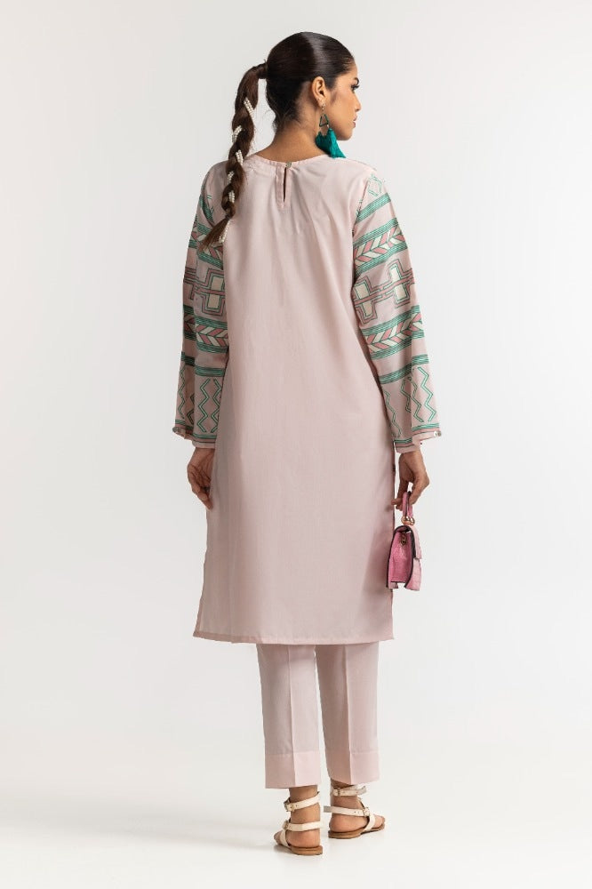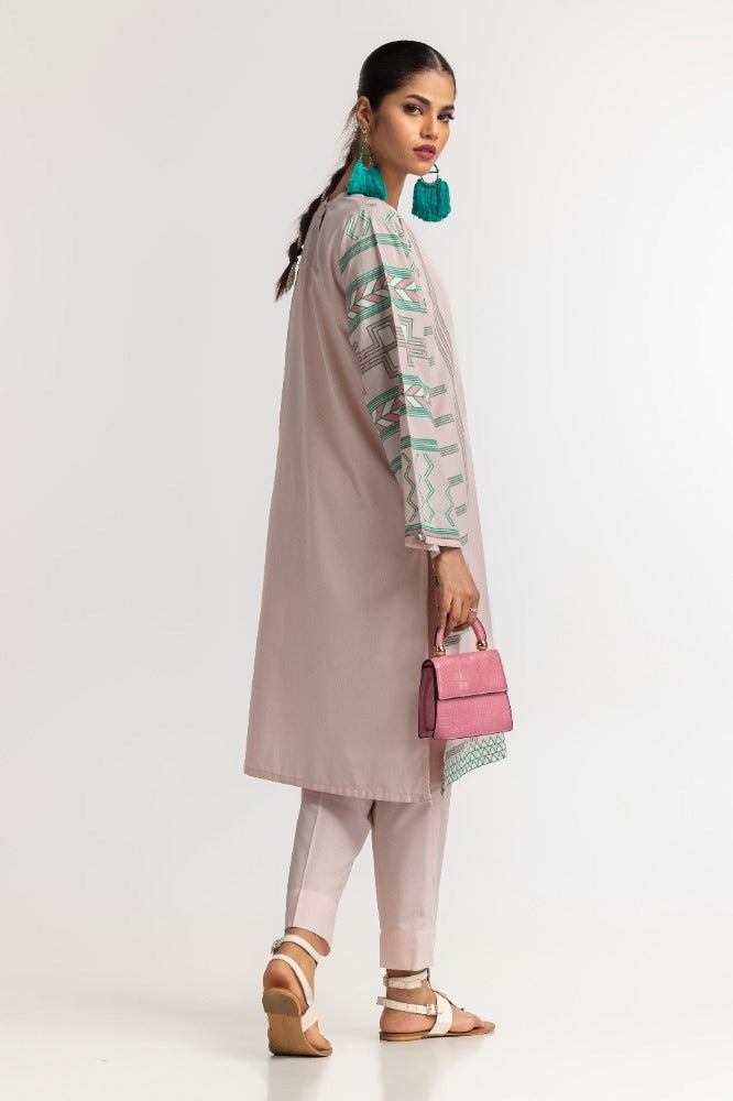 Styling your everyday look is easy with this light pink 2PC dyed polyester viscose suit. The shirt features screen prints on the sleeves, hem, and sides, with delicate embellishments on the placket. The matching single color straight trouser completes the look perfectly.