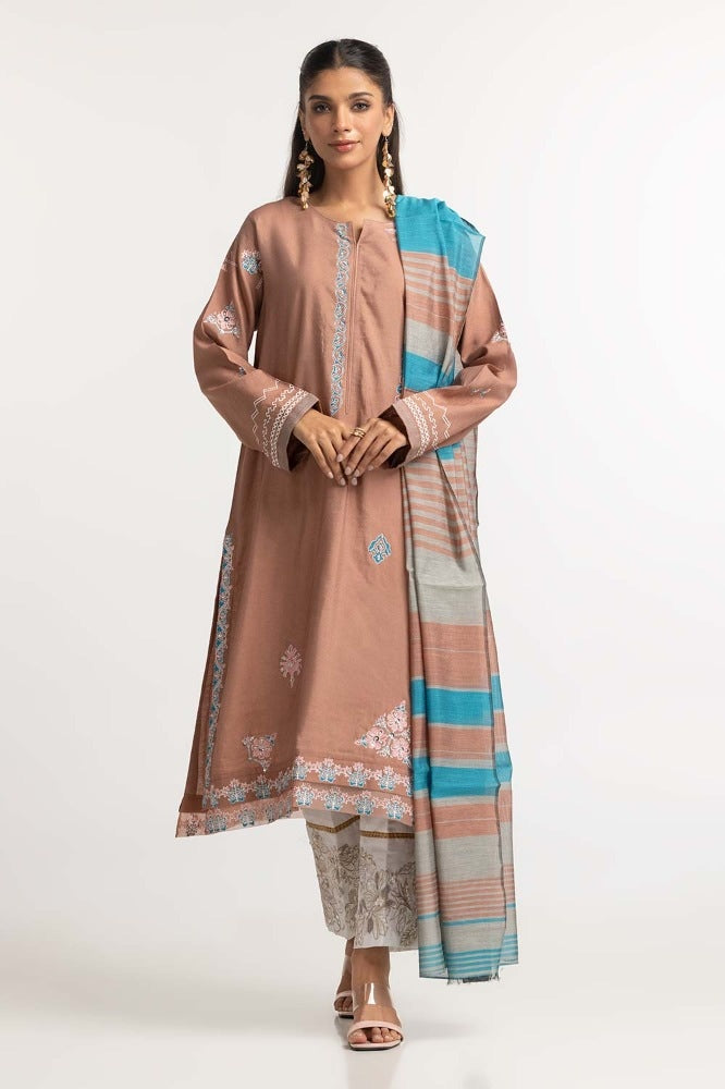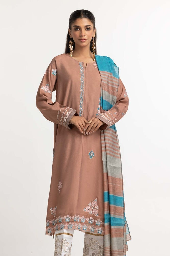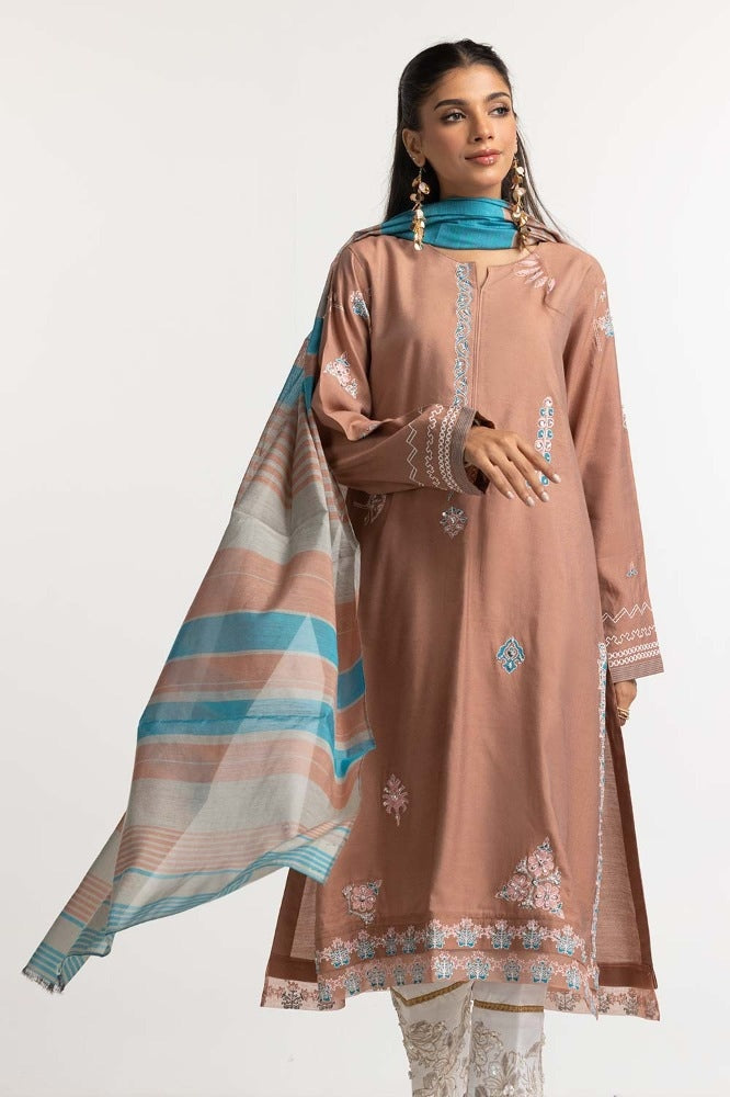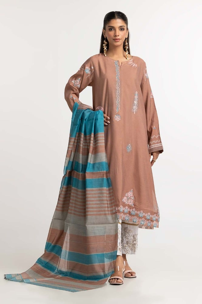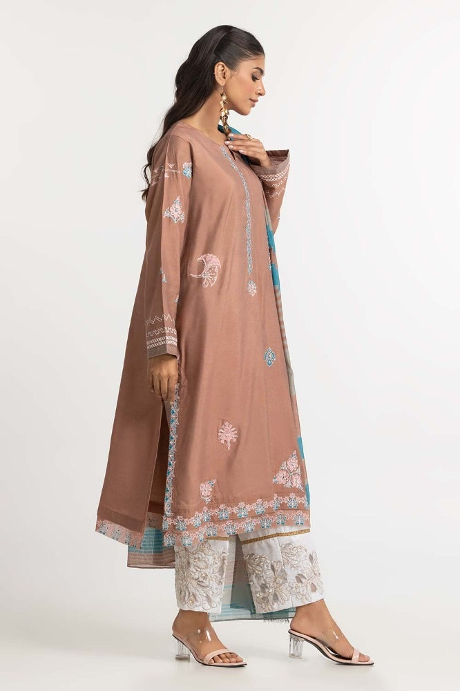 Ready to wear Add grace to your look with this 2 PC brown-dyed screen printed cotton net shirt featuring a boat style collar, intricate print alongside the placket, front and back hem, and sleeves, paired with a matching yarn dyed dupatta to round up the look.