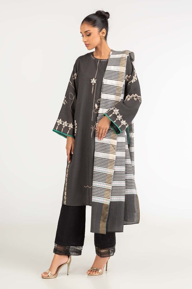 Ready to wear Experience simplicity in style with this 2 PC black-dyed screen-printed cotton net shirt, featuring a boat style neck, screen prints on the overall front and sleeves, and a complementing dupatta.