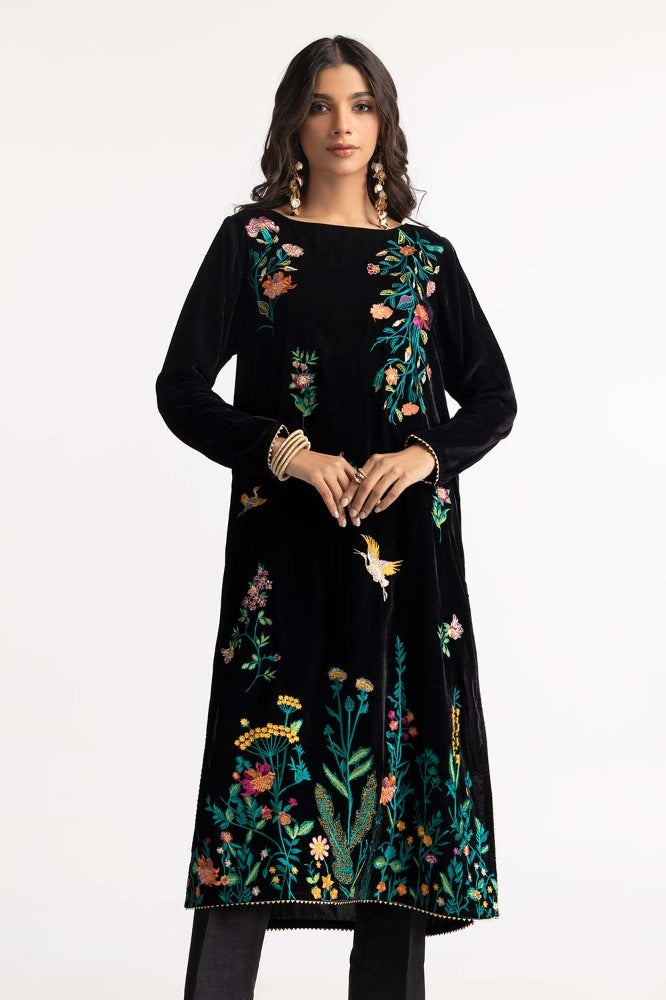Ready to wear Dyed Velvet Embroidered Shirt with a boat neck, full in length and a dorri with a tassel at a back. All is paired with a raw silk straight trouser."