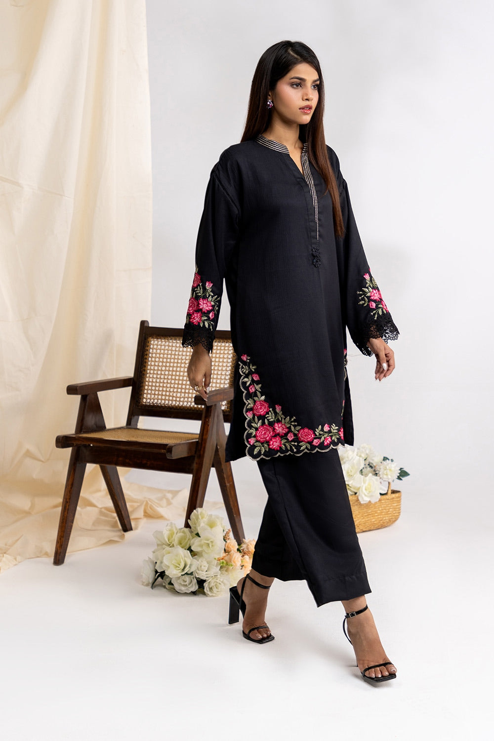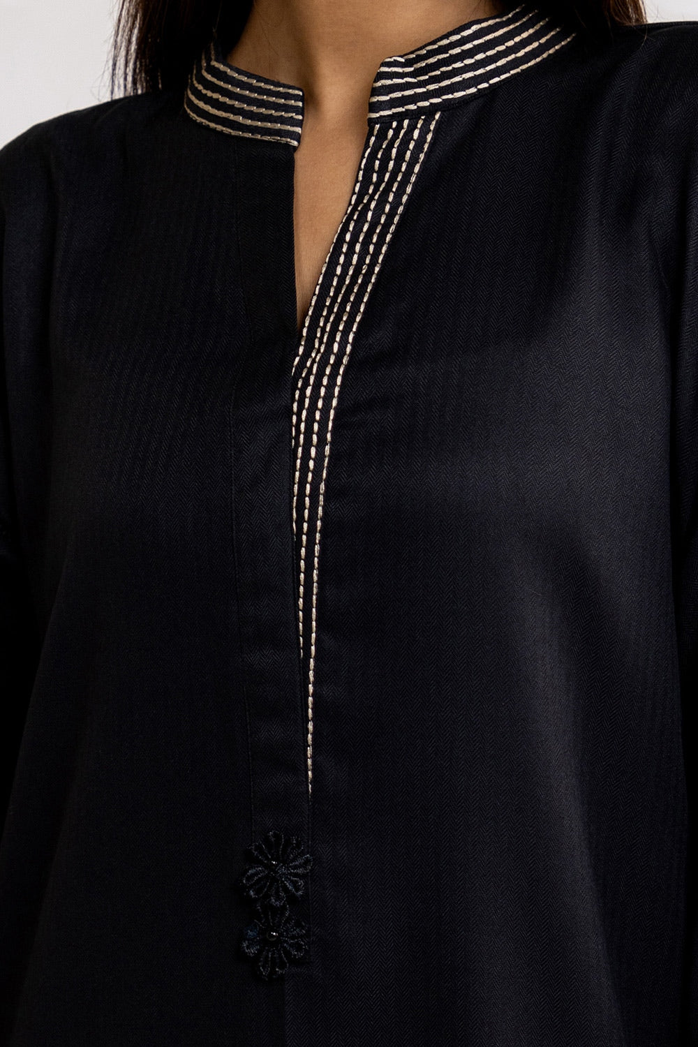 Exude sophistication with this black herringbone embroidered shirt paired with sleek straight pants. Crafted from premium herringbone fabric, the shirt's elegant embroidery adds a refined touch, while the classic straight trousers offer a tailored, polished look. Perfect for any occasion, this ensemble blends timeless style with modern elegance, making it a versatile addition to your wardrobe.