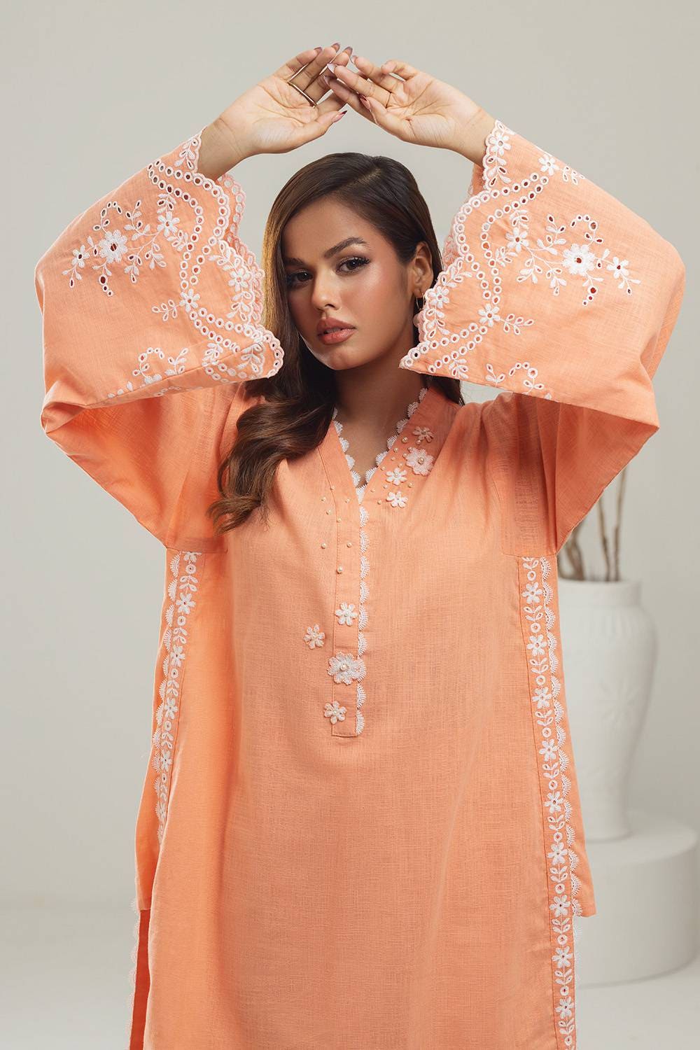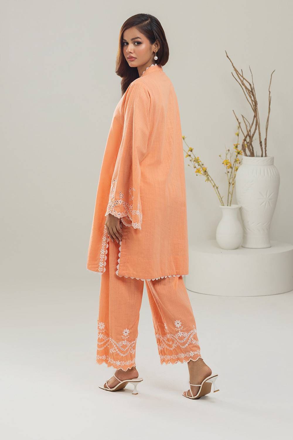 Ready to wear Embrace the elegance with this 2PC peach co-ord set with a v-neckline. The kurta features beautiful embroidery on the placket and sleeves for added style. Comes with matching straight trousers with embroidery at the hem of the trouser, perfect for a chic and sophisticated ensemble.