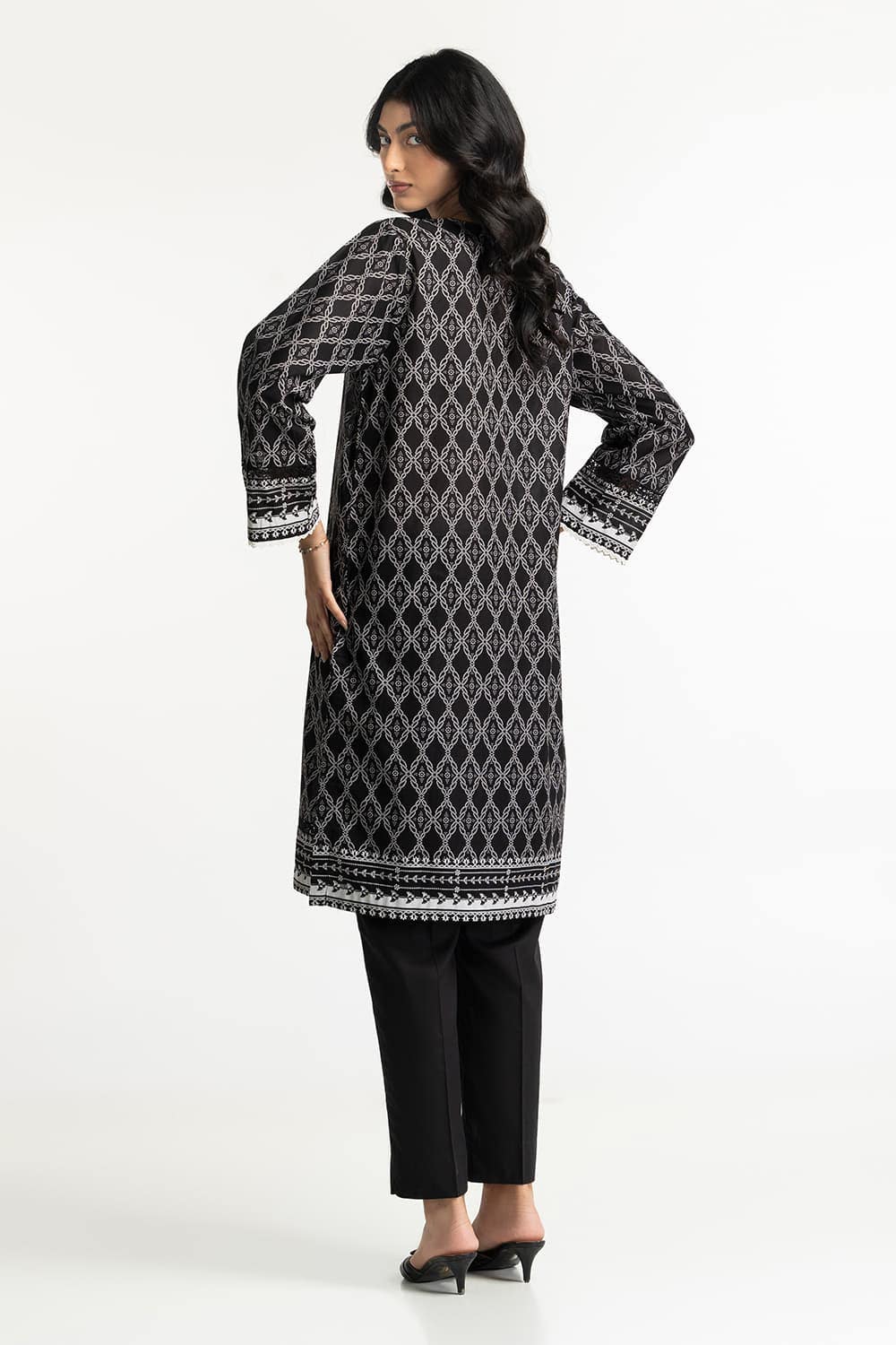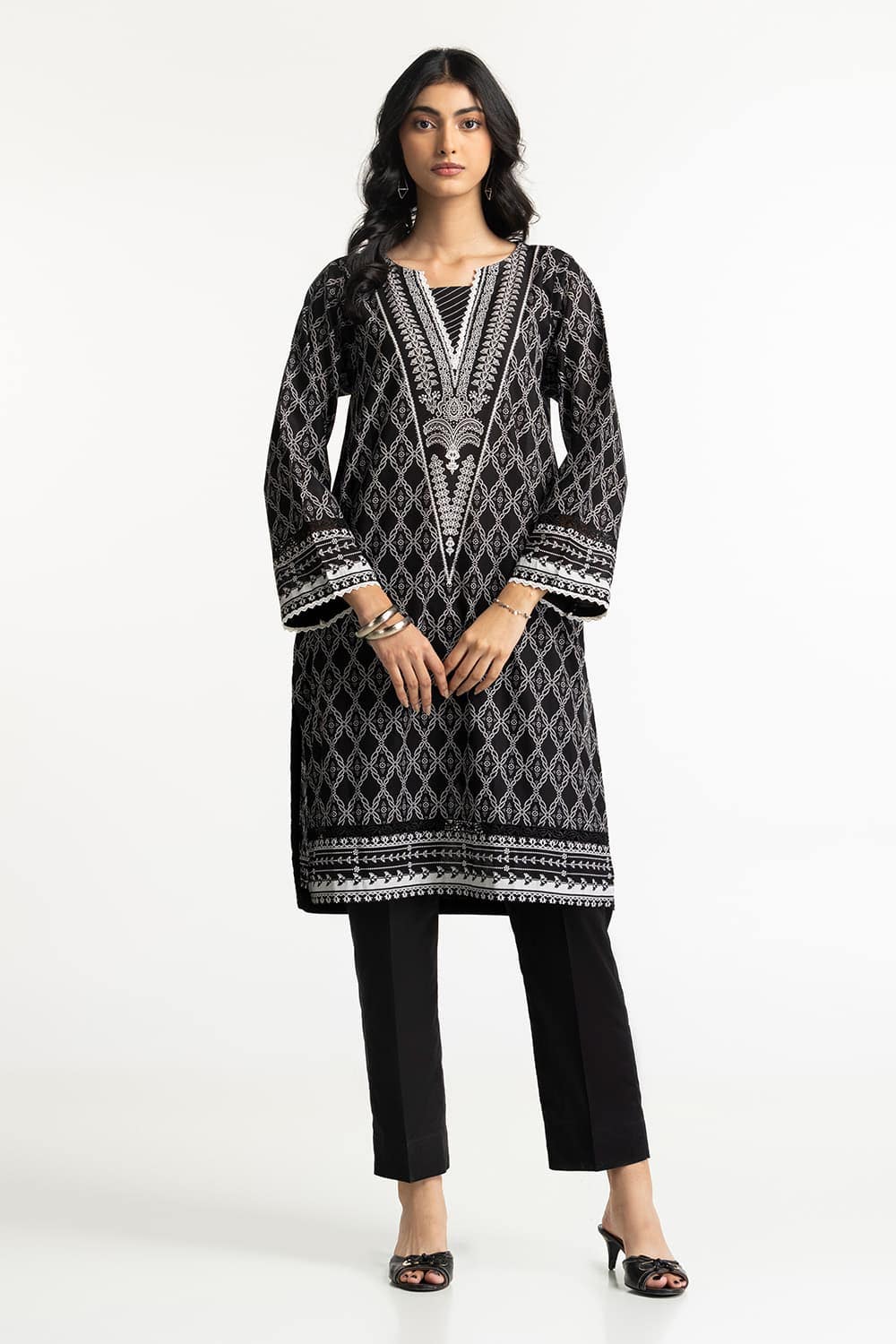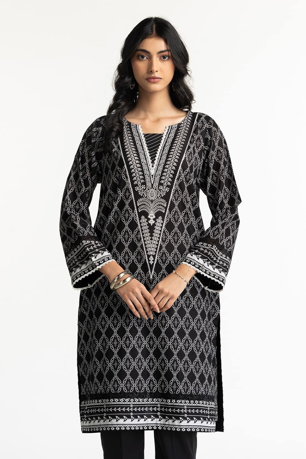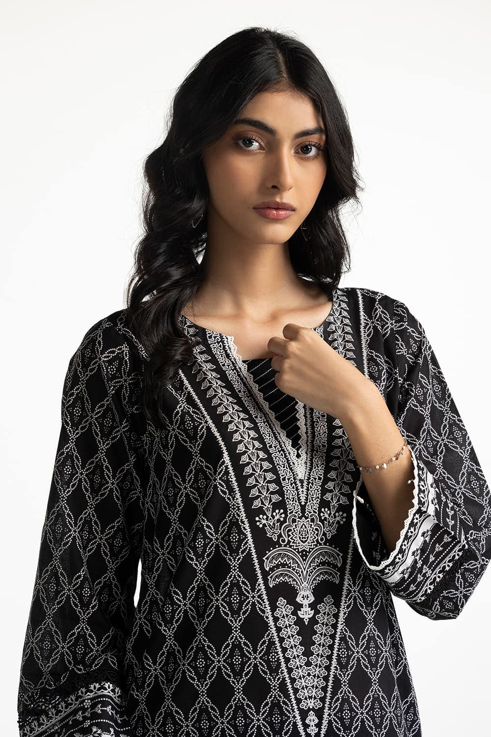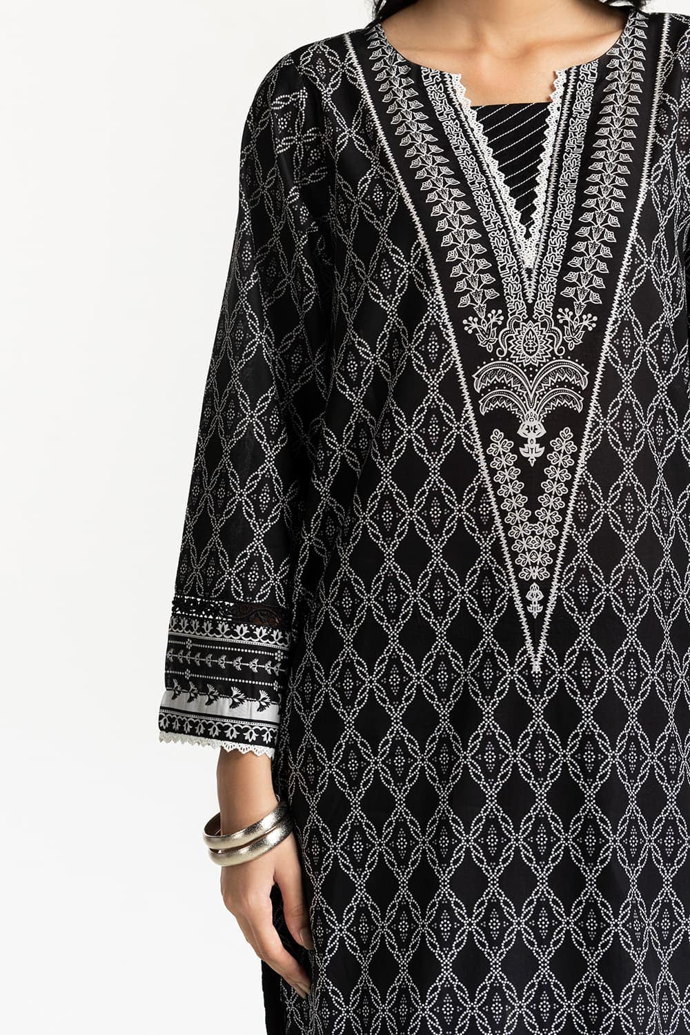 Ready to wear Perfect for a sophisticated look, this 2PC black outfit features intricate white geometric patterns. The sleeves are adorned with matching details, and the straight hem is bordered elegantly. The V-shaped neckline is accentuated with delicate prints, adding a touch of refinement to the attire.