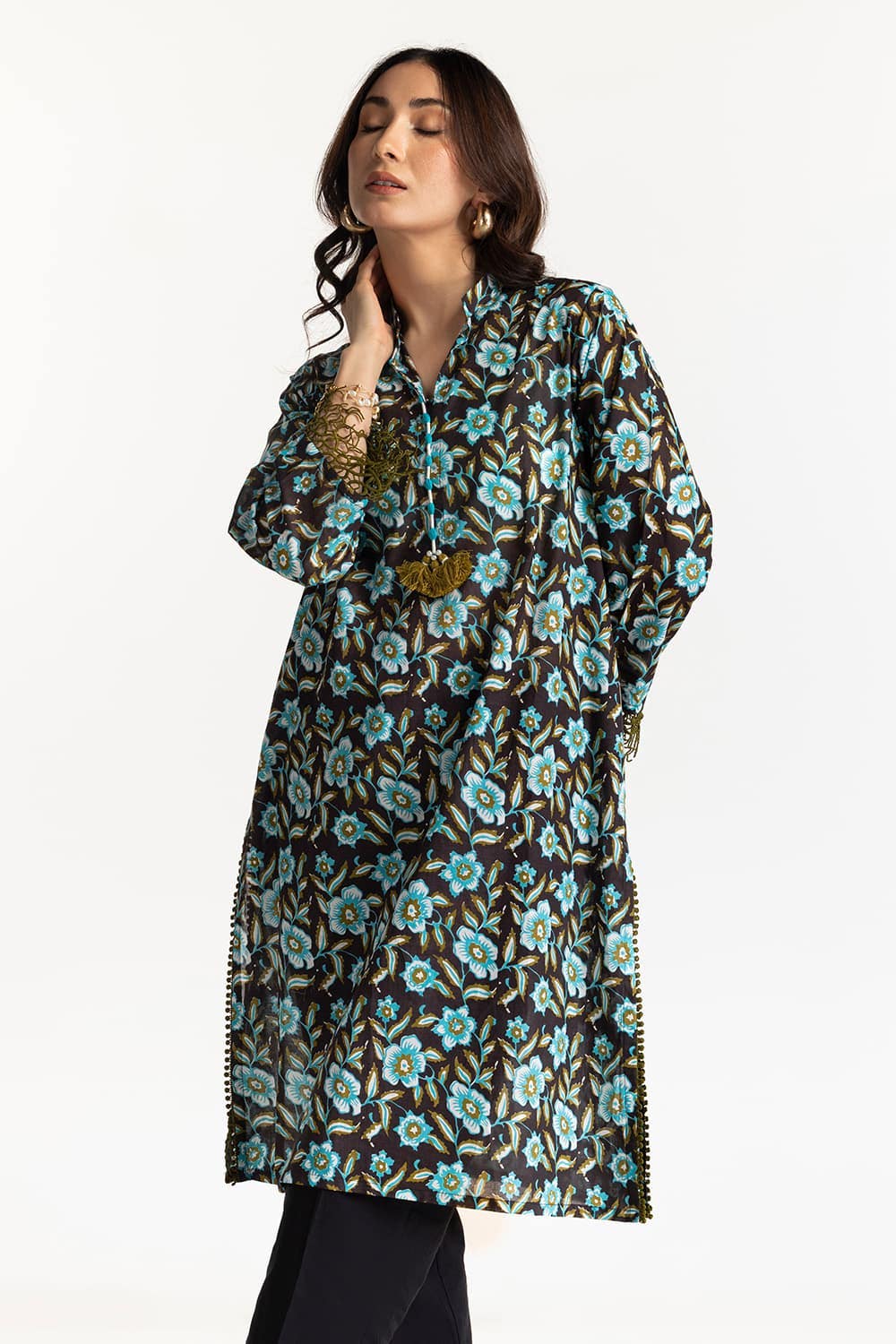 Ready to wear Add a pop of color to your wardrobe with this black kurta, featuring vibrant blue floral prints. The lace detailing on the sleeves adds a touch of elegance to this striking piece.