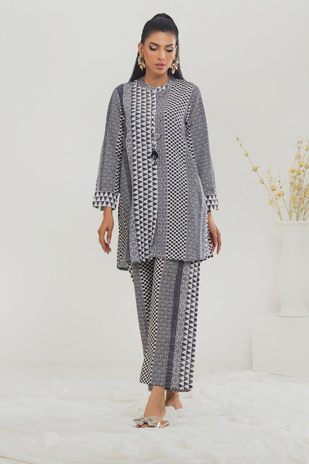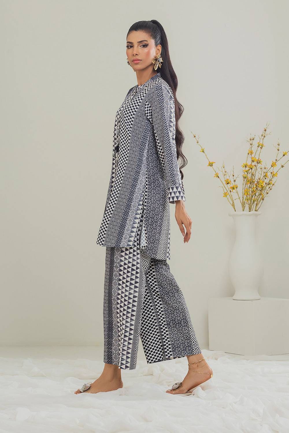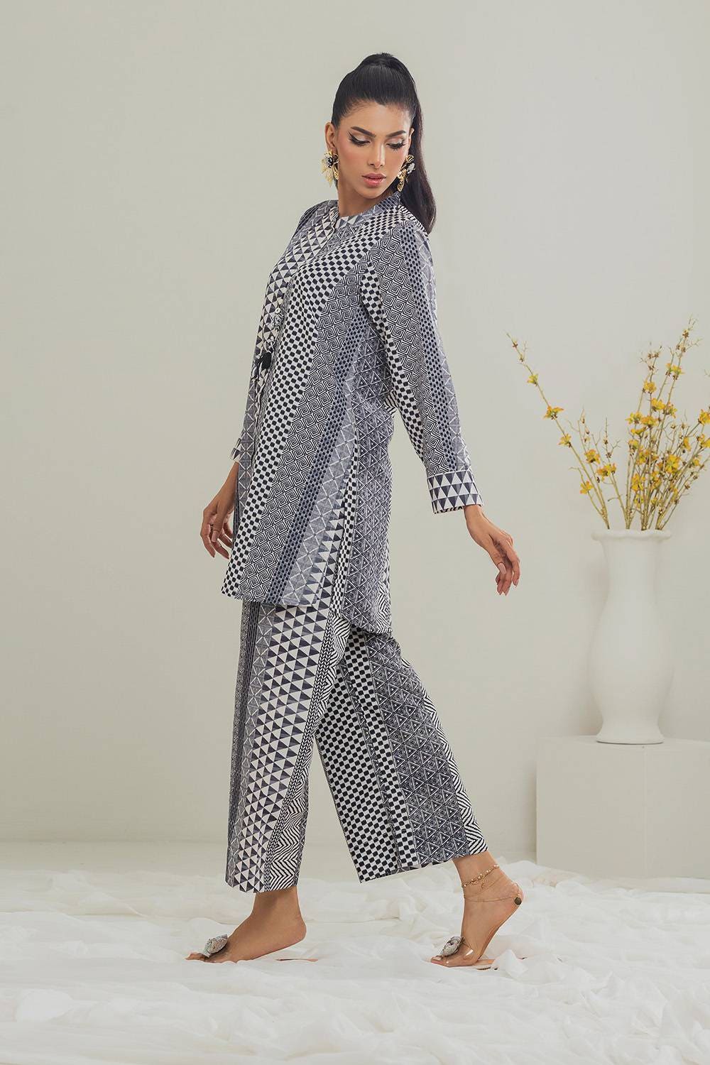Ready to wear Create a style statement with this monochromatic 2PC co-ord set. The kurta features a mix of classic geometric , a round neckline, short length, rounded hem and highlighted with a matching tassels at the placket. The seamless pattern throughout the dress and makes it an ideal ensemble.