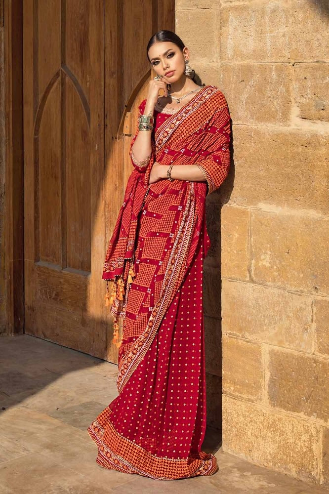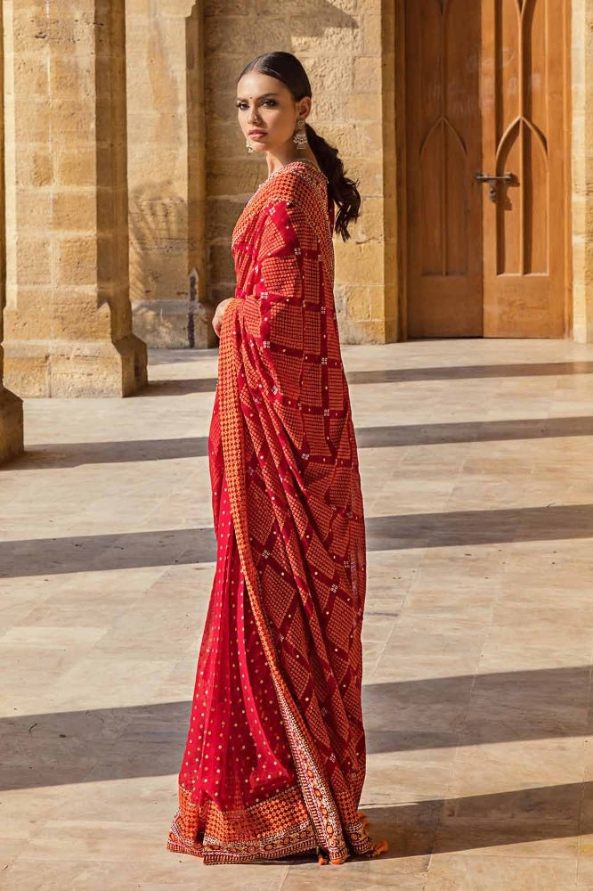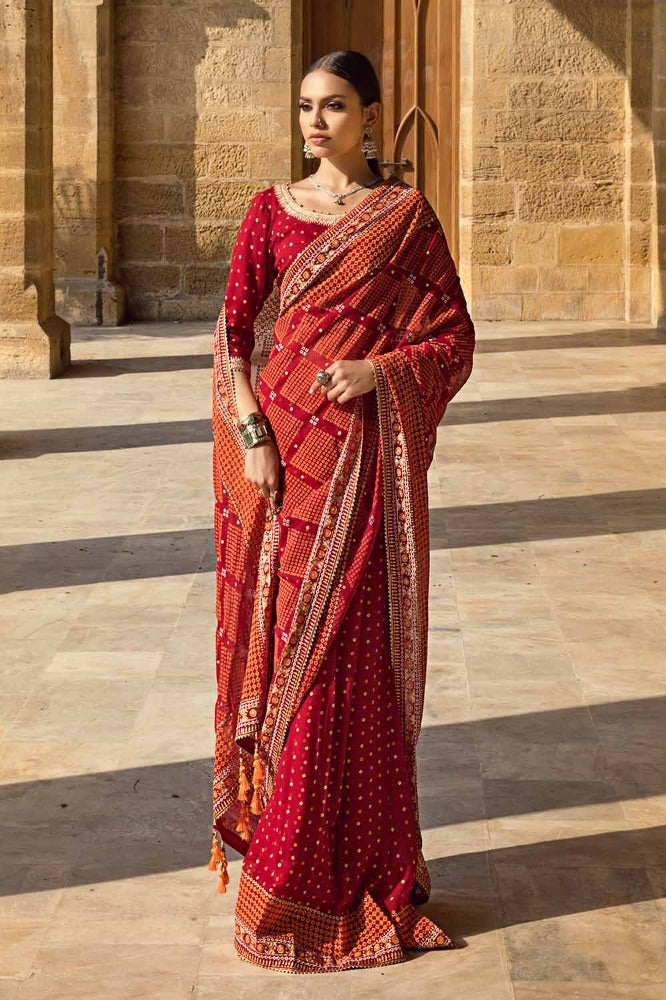 2 Piece Embroidered Gold and Lacquer Printed Chiffon Unstitched Saree with Raw Silk Blouse PRS-42004