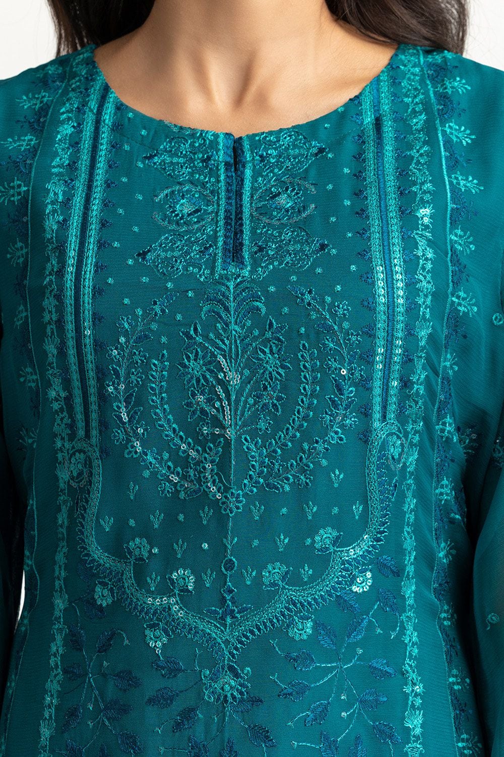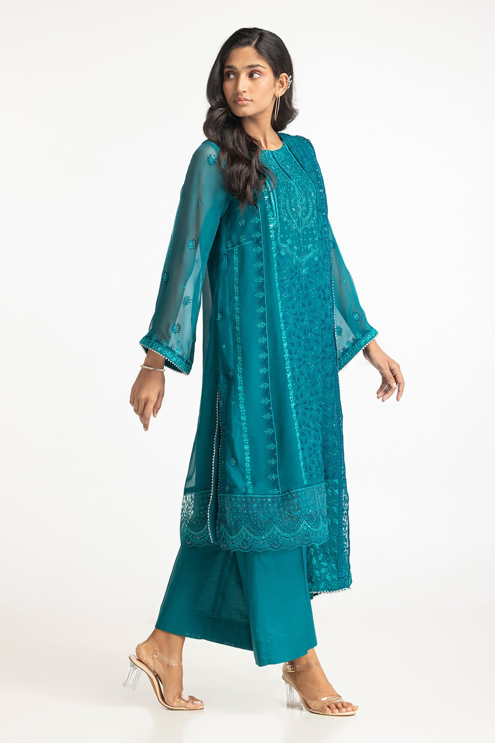 Ready to wear Elevate your elegance in this 3PC teal ensemble featuring intricate embroidery and sheer sleeves. The detailed patterns on the kameez and dupatta bring sophistication, perfect for festive and formal occasions.