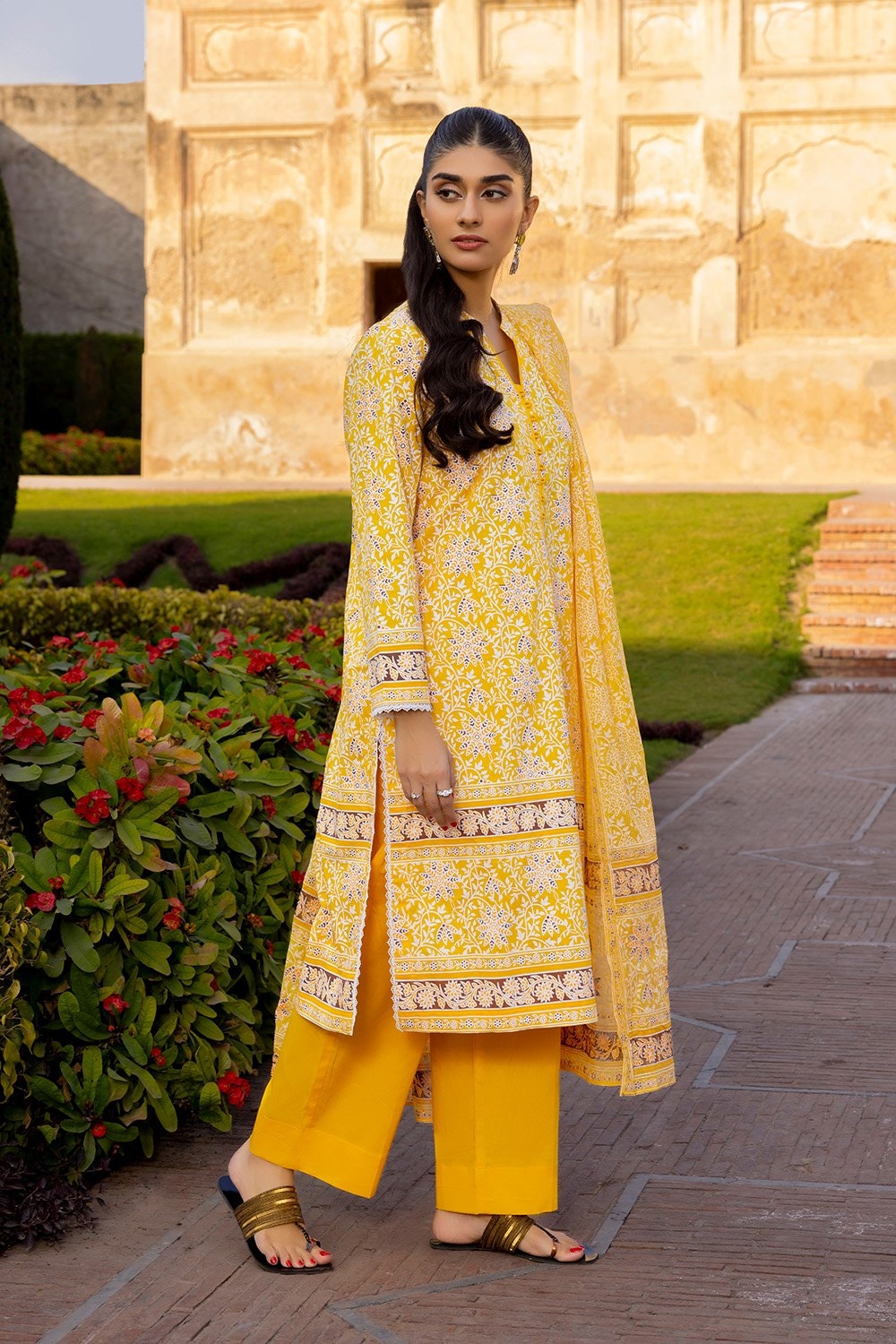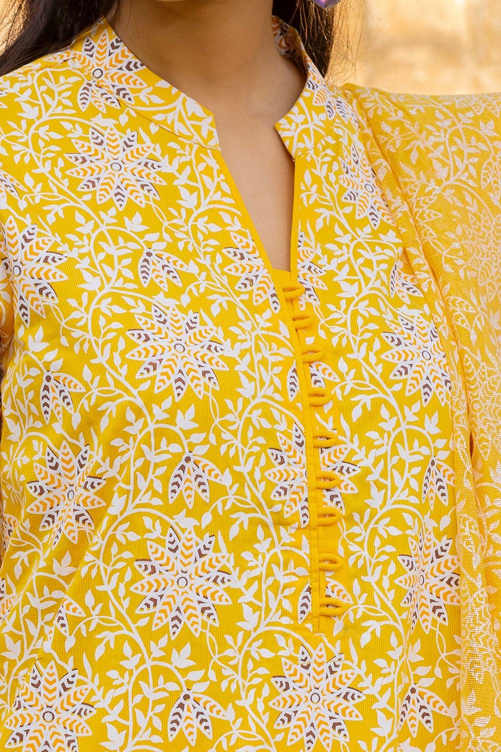 Brighten up your wardrobe with this vibrant 3Pc Yellow Corduroy Block Printed Suit. Featuring a cozy corduroy shirt and straight pants, paired with a beautifully block-printed khaddi net dupatta, this outfit combines warmth and elegance, making it a perfect choice for a standout look.