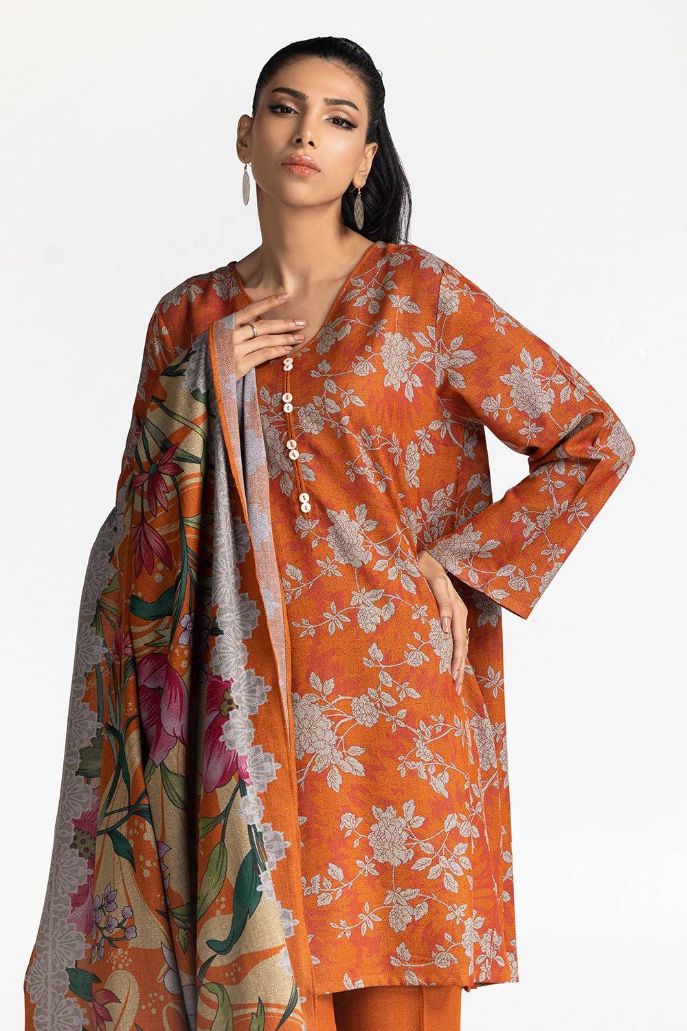Ready to wear This kurta features a soft v- neck and floral prints. Paired with wide leg trouser and a contrasting dupatta, it creates a vibrant and comfortable everyday look.