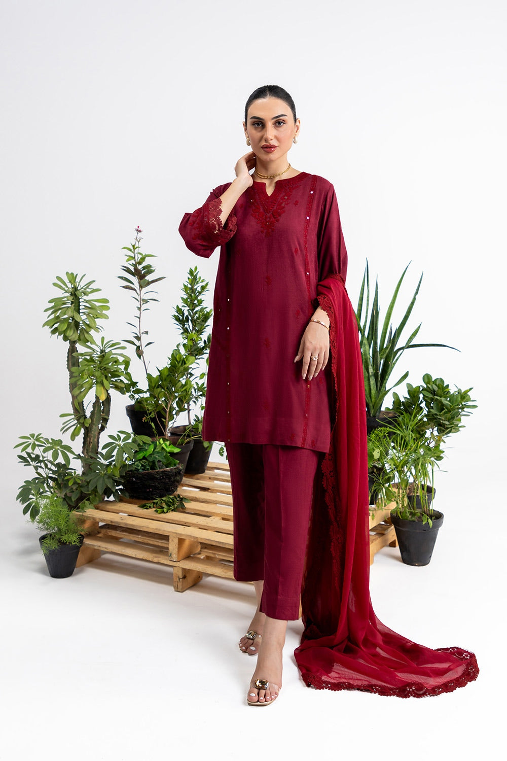 Exude confidence and style with the 3Pc Dyed Embroidered Acrylic Suit in rich maroon. This striking set includes a beautifully dyed acrylic shirt and matching trousers, offering both comfort and sophistication. The straight pant silhouette adds a sleek, modern edge, while the solid poly chiffon dupatta enhances the ensemble with its graceful flow. Ideal for those who love bold color and refined simplicity!