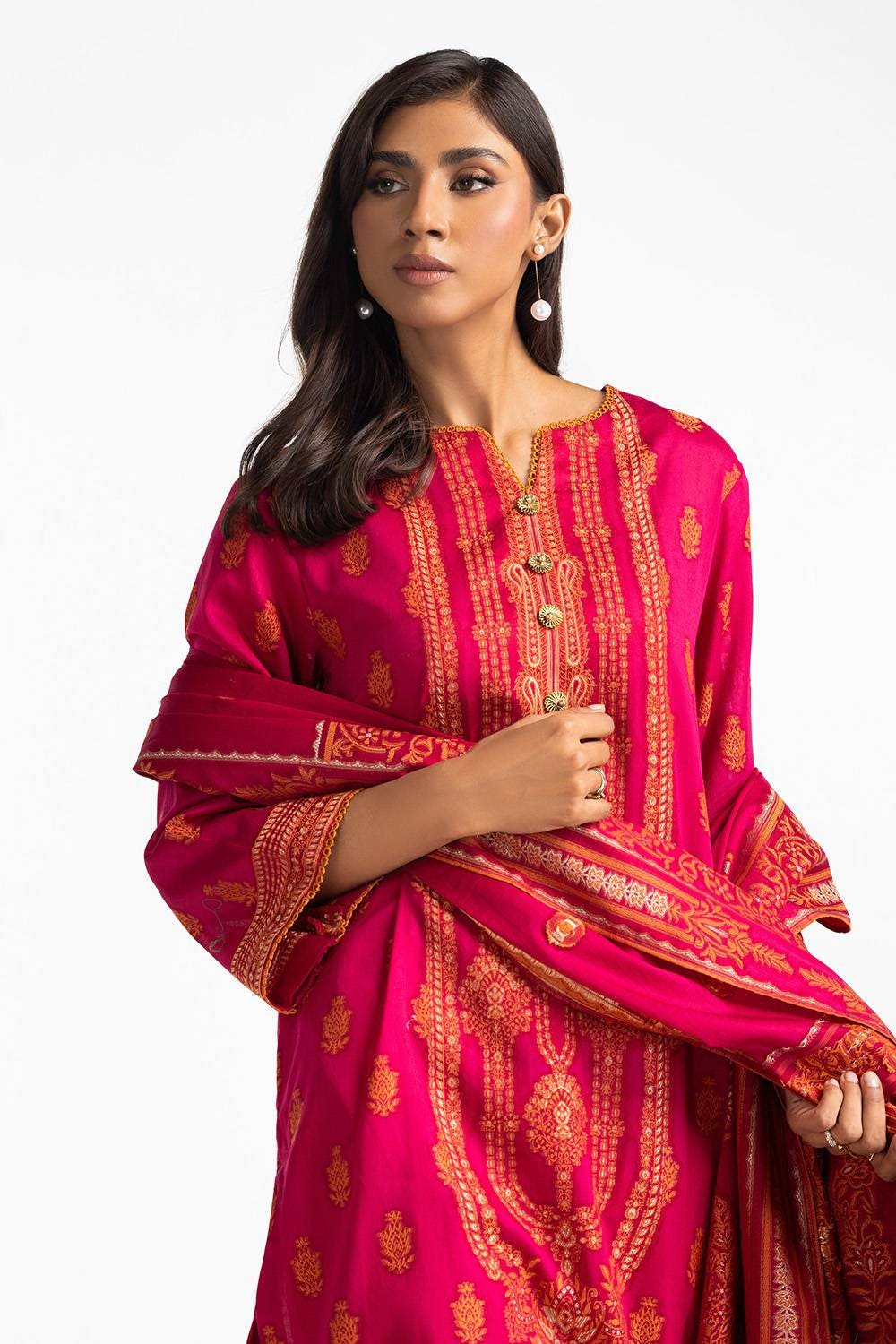 Ready to wear This 3PC vivid pink ensemble features golden work, creating a glamorous look. The rich color and intricate design make it an ideal choice for festive gatherings and celebrations.