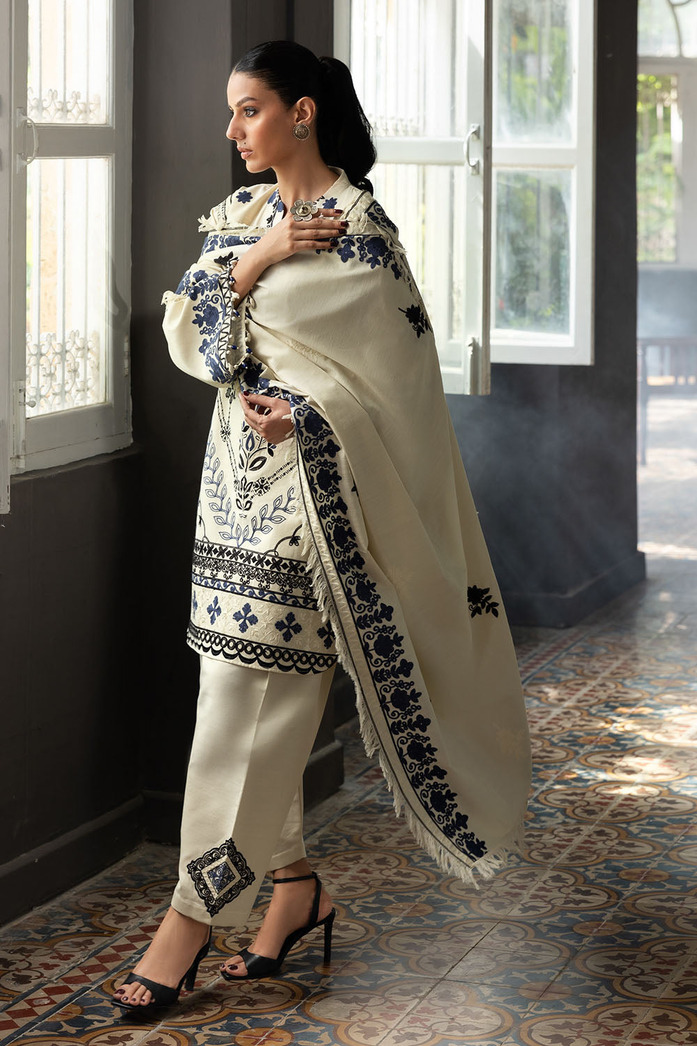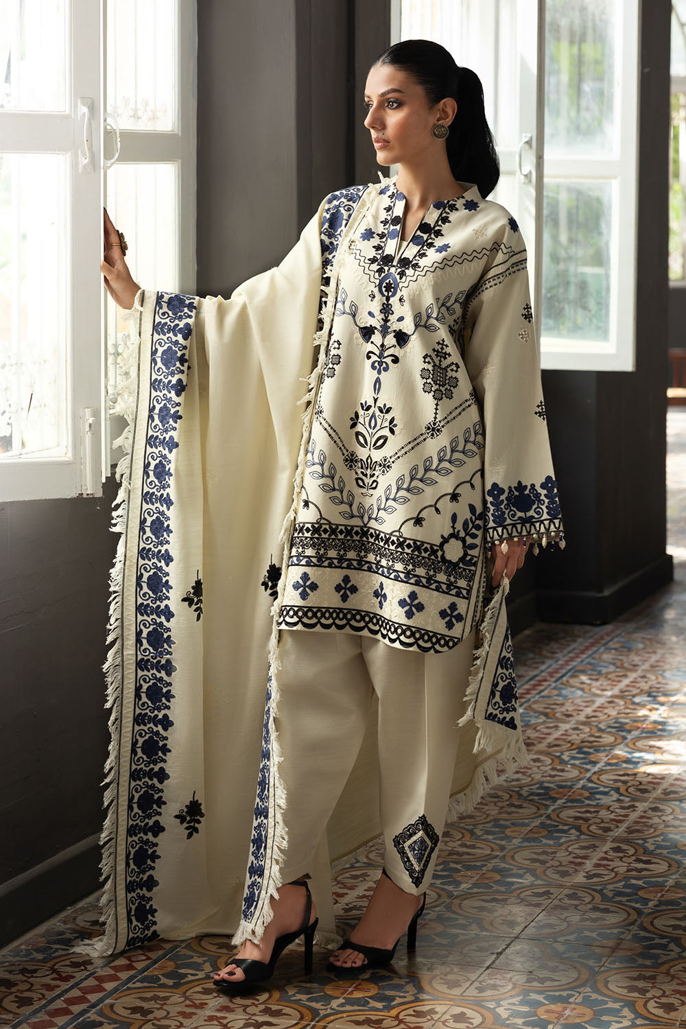 • Embroidered Khaddar Shirt Front, Back & Sleeves with Embroidered Borders for Front & Back. Embroidered Side Bunches & Lace for Front & Back Chalk - 2.8 Meters