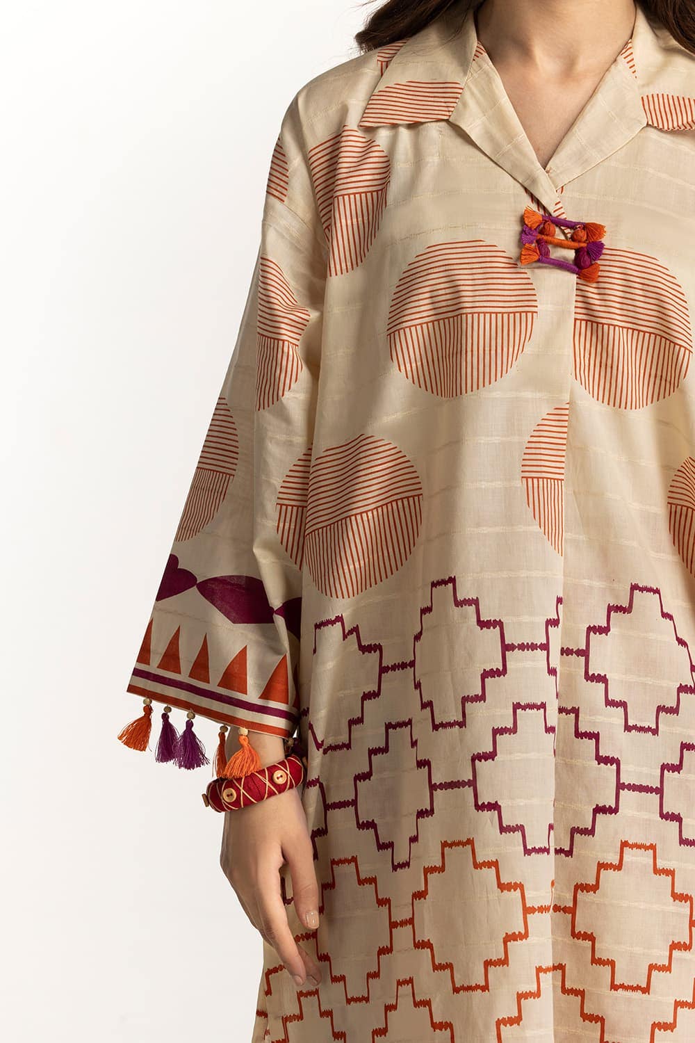 Ready to wear Brighten your day with this 3PC beige and orange jacquard suit. The vibrant geometric patterns and playful tassel details add a fun yet sophisticated flair to your wardrobe.
