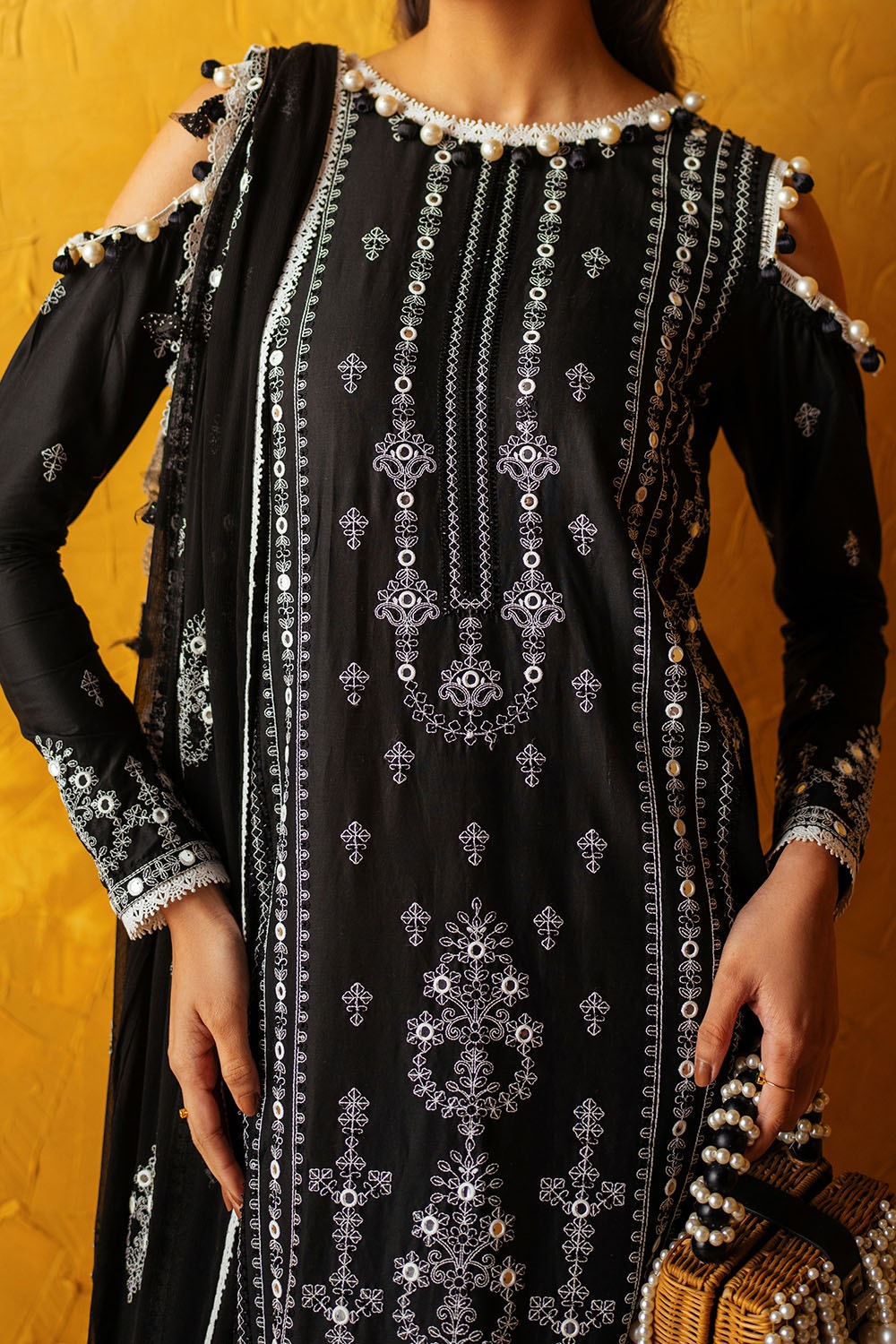 • Sequins Embroidered Lawn Shirt Front with Beads. Sequins Embroidered Lawn Back & Sleeves. Embroidered Borders for Front, Back & Sleeves on Organza - 2.28 Meters