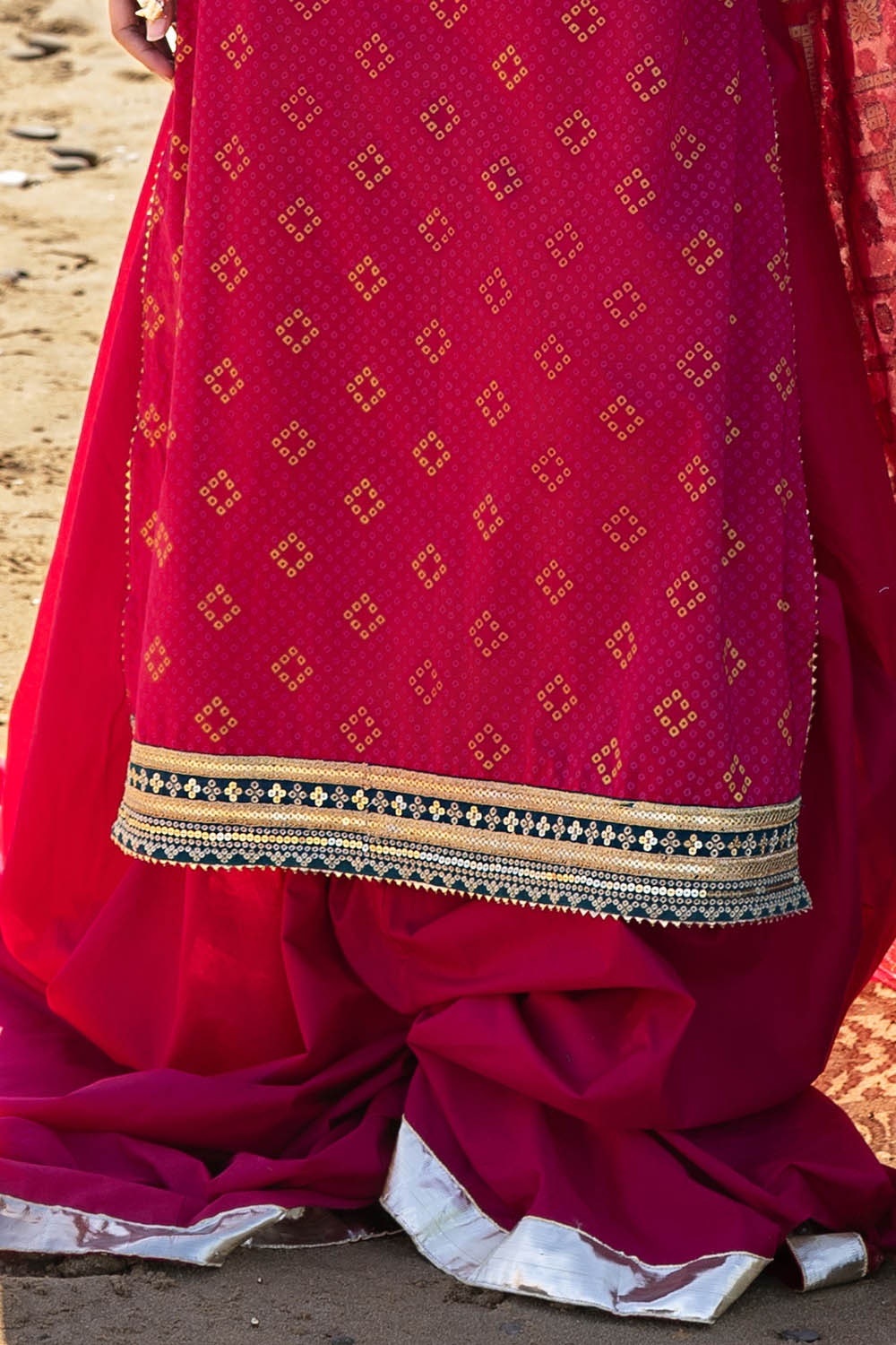 • Gold & Lacquer Printed Cotton Silk Shirt Front & Back. Sequins, Zari & Dori Embroidered Cotton Silk Sleeves. Sequins, Zari & Dori Embroidered Cotton Silk Neckline & Border for Shirt. Sequins & Zari Embroidered Cotton Silk Laces for Back & Sleeves - 3 Meters