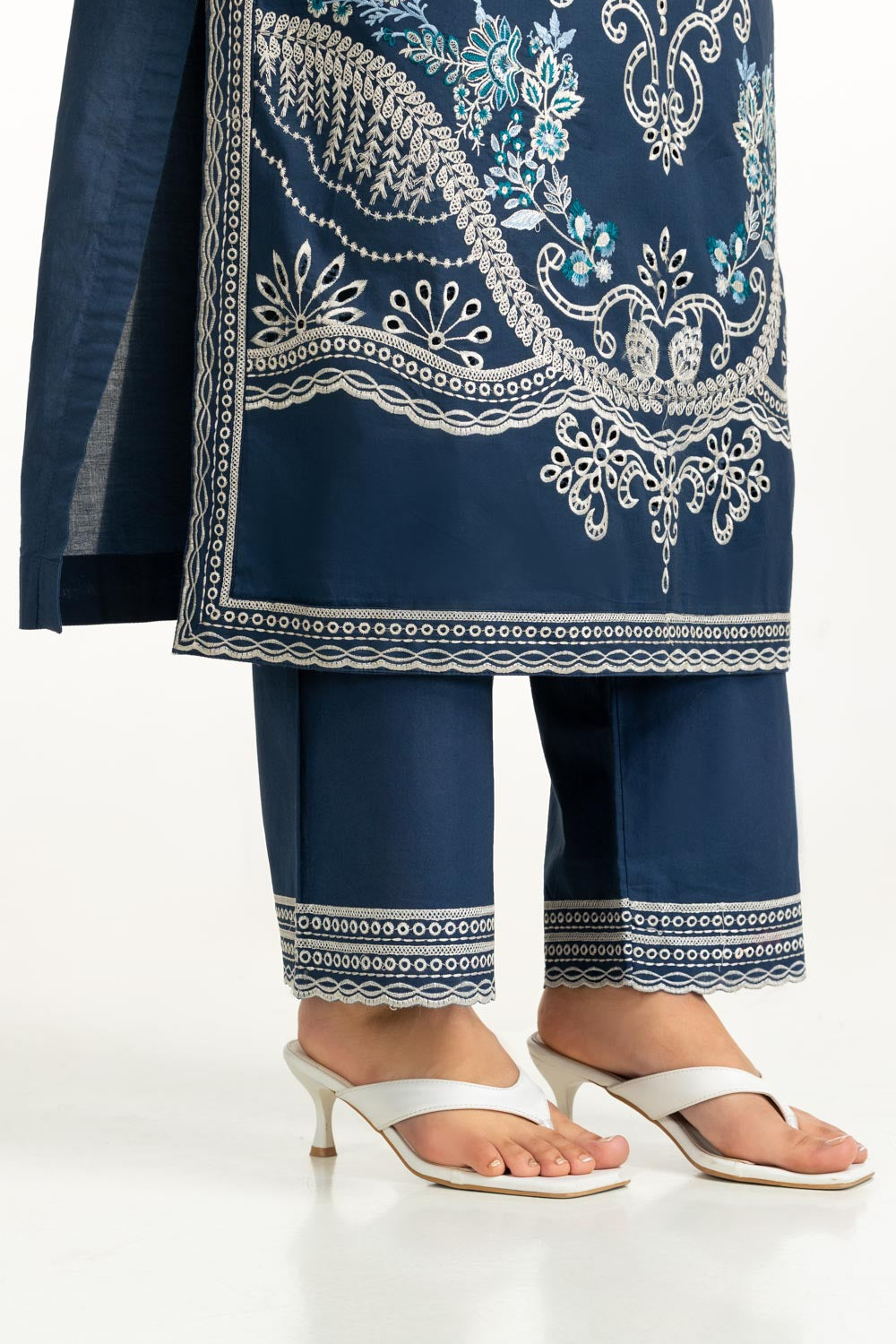 Details: Embroidered suit featuring a Round-Neckline with delicate Lacework and Tassels.