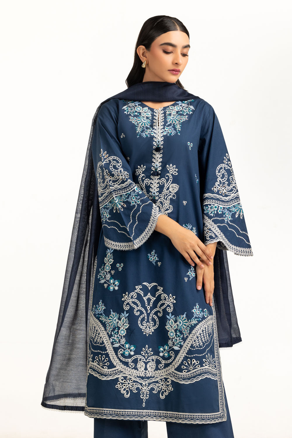 This embroidered three-piece suit is a versatile semi-formal choice for the season. The soft cambric construction and regular fit make it suitable for light winter layering, complemented by a soft breezy dupatta. An effortless and refined pick for small gatherings.