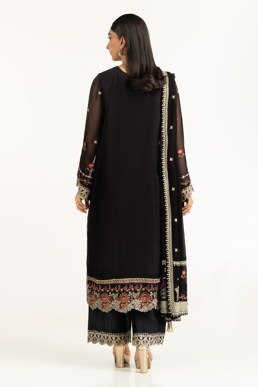 This chiffon suit features intricate embroidery in delicate floral patterns across the shirt and dupatta, offering a soft yet striking aesthetic. The sheer, breezy Lawn fabric of the trousers keeps you at ease during summer festivities, while its detailed craftsmanship radiates quiet sophistication. A refined choice for summer festivities.