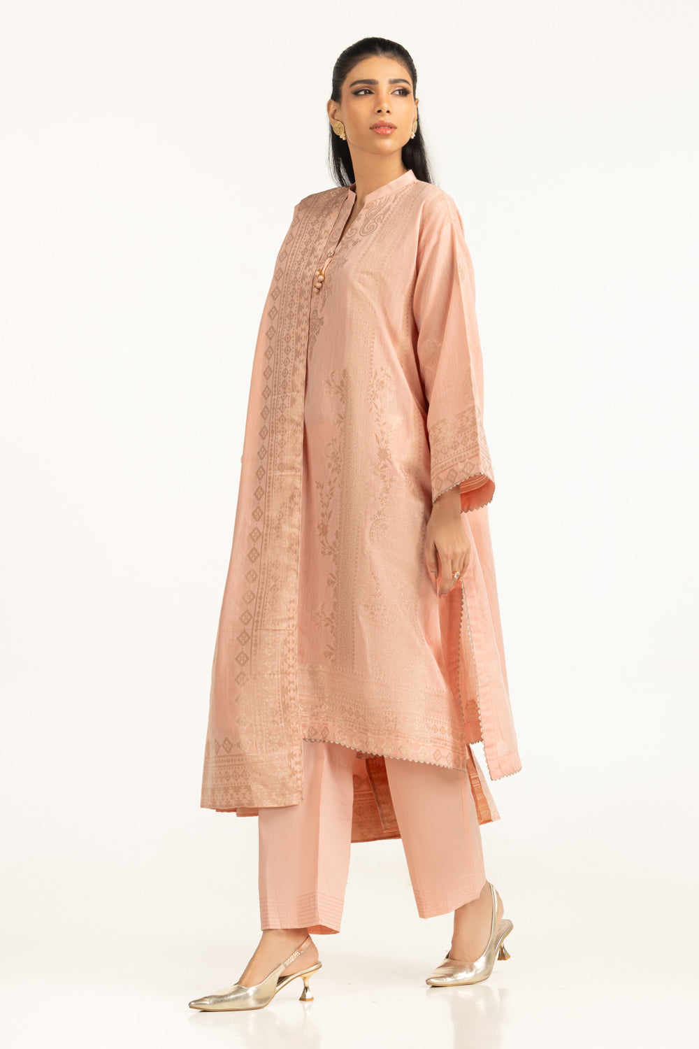 Soft peach hue paired with lightweight jacquard fabric creates a summer-friendly outfit that feels structured yet breathable. The relaxed-fit silhouette supports extended wear and natural movement, allowing the suit to remain comfortable during daytime occasions and gatherings.