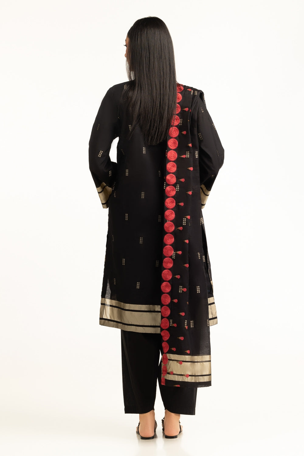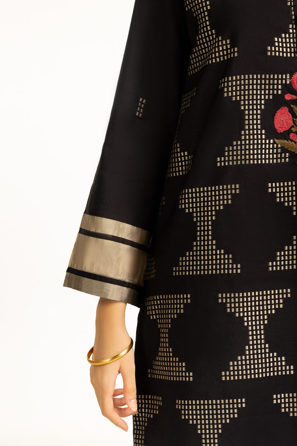 This Jacquard suit redefines summer comfort with its loose fit and lightweight feel. Highlighted by a vibrant floral embroidery with a soothing gold texture, that embodies a timeless yet trendy appeal. This outfit is perfect for maintaining elegance in heat.