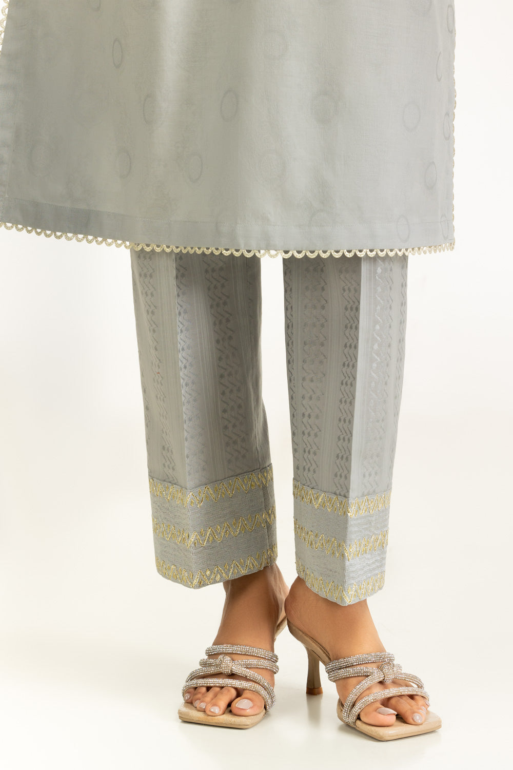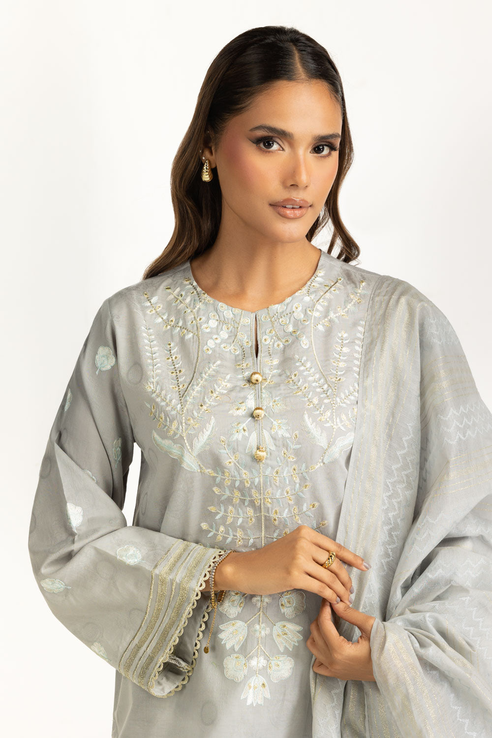 Neutral grey shade paired with subtle jacquard texture create a calm, versatile look suited for summer days. The loose-fit silhouette allows ease of movement and long wear, while the understated embroidery adds refinement, making it a reliable option for semi-formal settings.